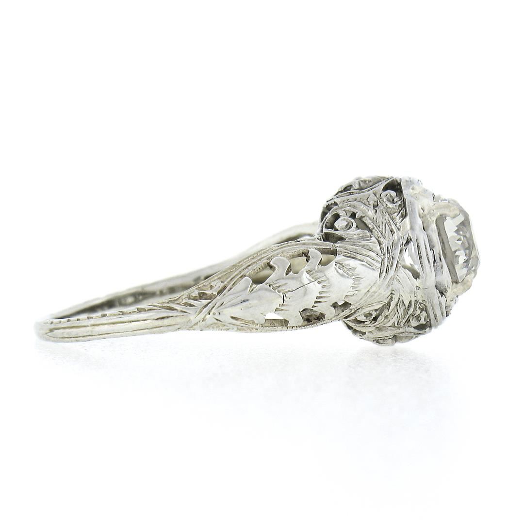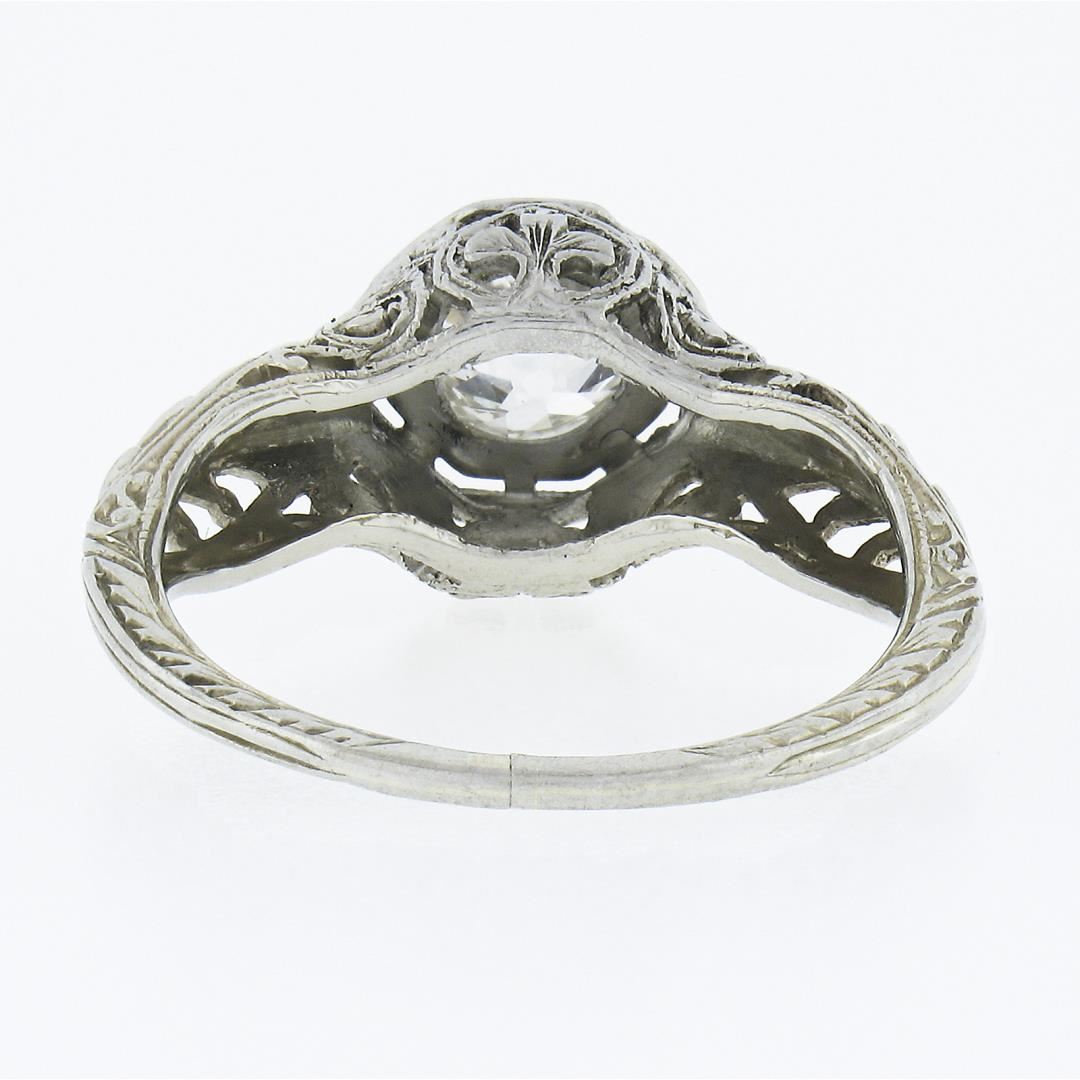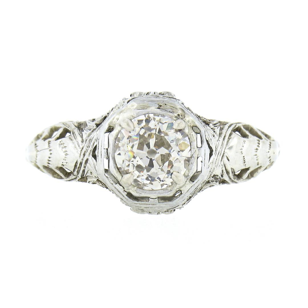 An antique solid 18k white gold engagement ring, with 1 GIA graded old european cut natural diamond (J - VS2 ; 0.94ct). The ring is size 6.0, weighs a total of 3.06 grams, and measures 9.70mm wide. Comes with all original relevant certifications.