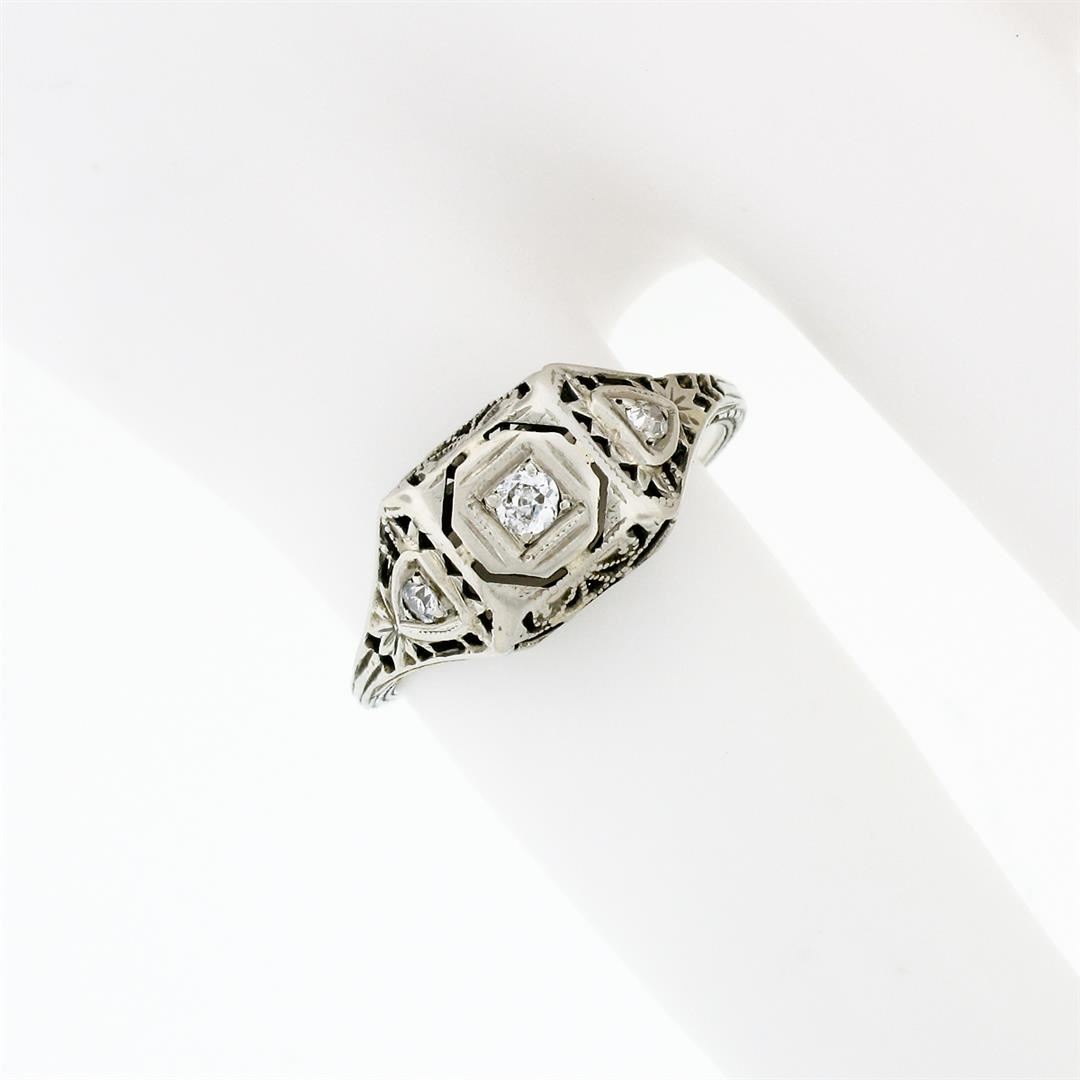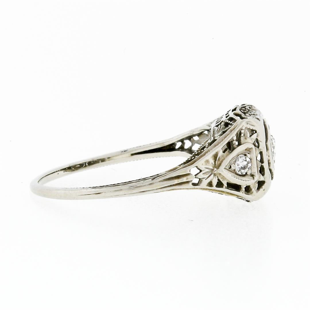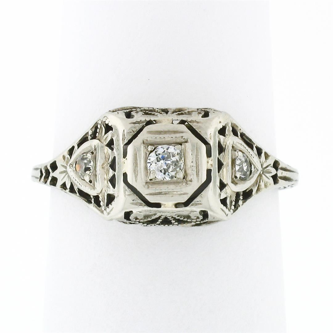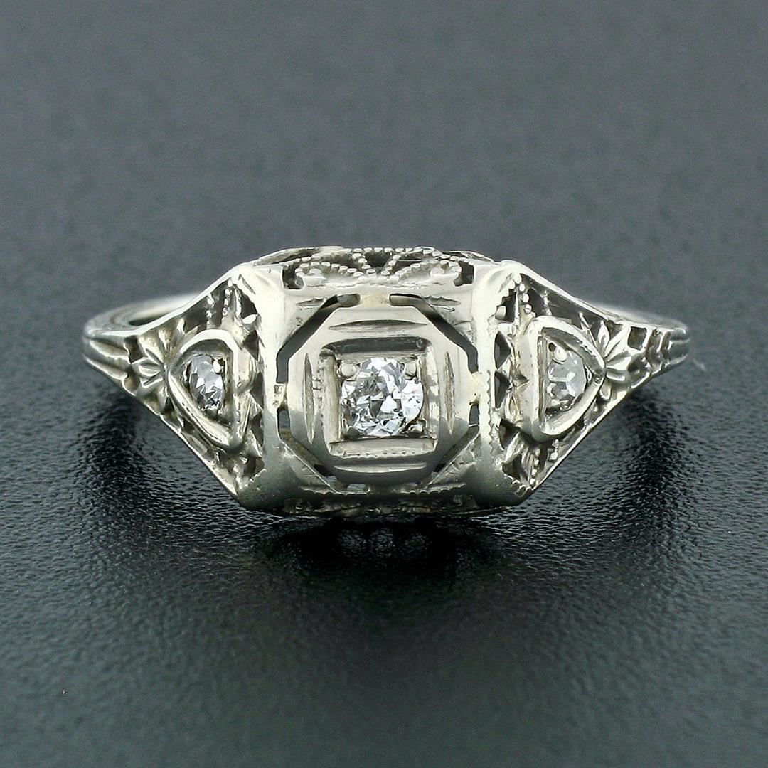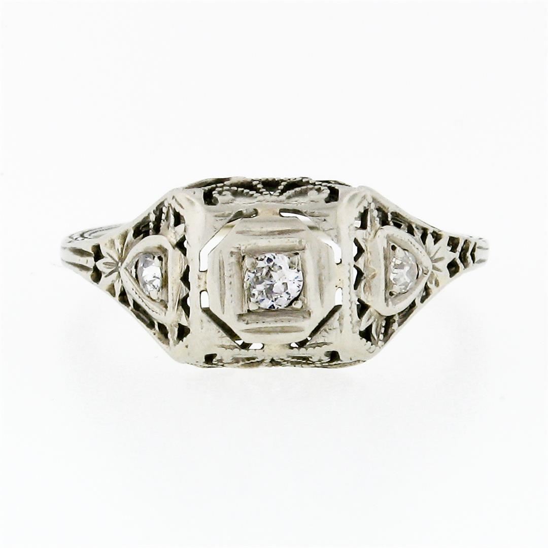 An antique art deco solid 18k white gold filigree ring, with 3 old european and single cut natural diamonds (G/H - VS2/SI1 ; 0.11ctw). The ring is size 4.5, weighs a total of 1.62 grams, and measures 7.80mm wide.