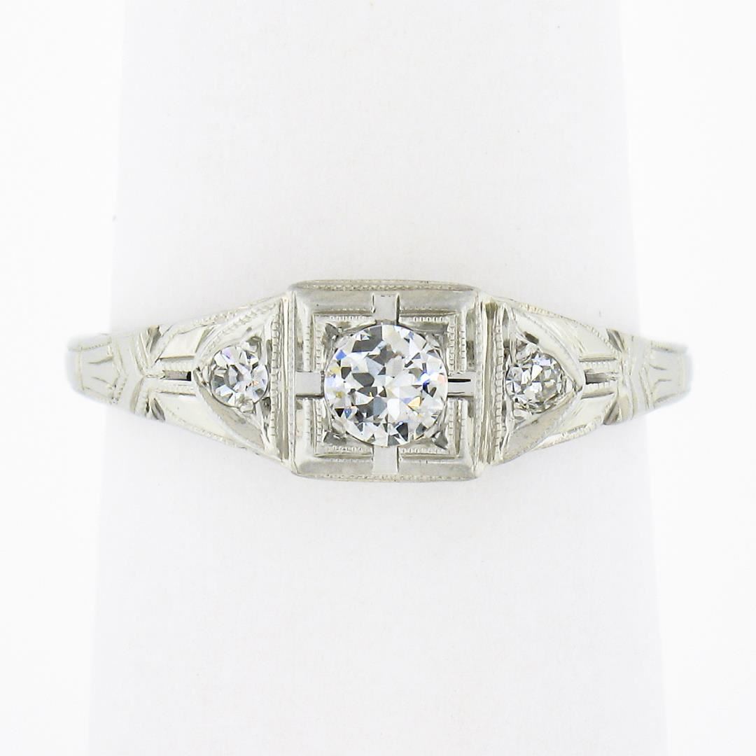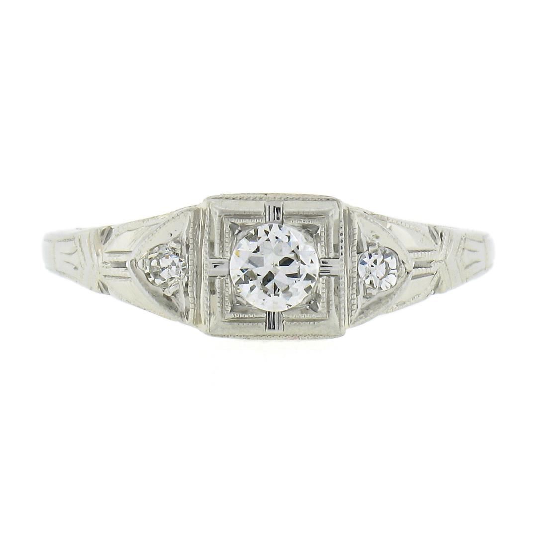 An antique solid 18k white gold ring, with 1 old European cut natural diamond (F - VS2 ; 0.20ct), and 2 old single cut natural diamonds (G/H - SI1-SI2 ; 0.04ctw). The ring is size 6.5, weighs a total of 2.20 grams, and measures 6.1mm wide.