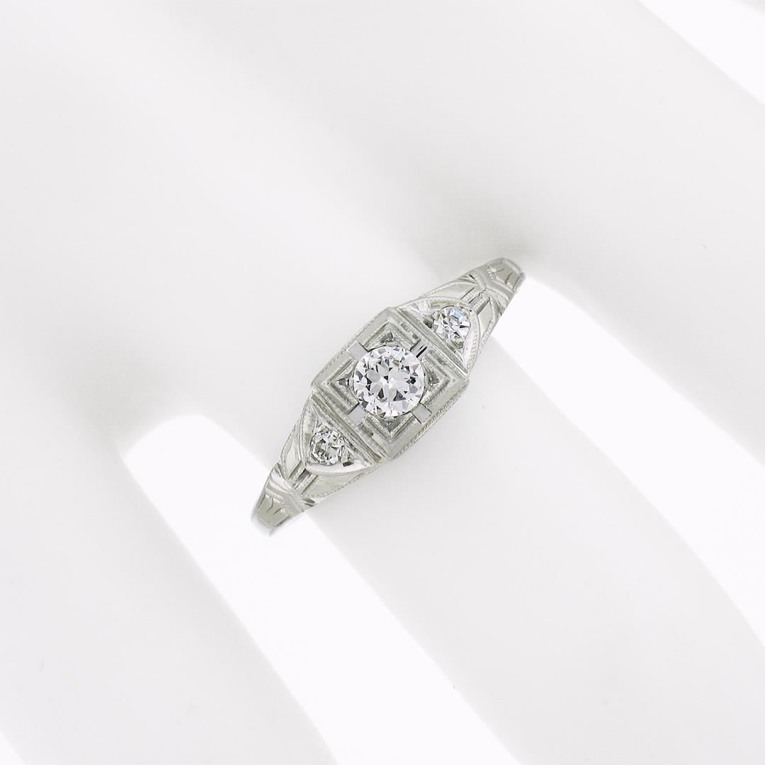 An antique solid 18k white gold ring, with 1 old European cut natural diamond (F - VS2 ; 0.20ct), and 2 old single cut natural diamonds (G/H - SI1-SI2 ; 0.04ctw). The ring is size 6.5, weighs a total of 2.20 grams, and measures 6.1mm wide.
