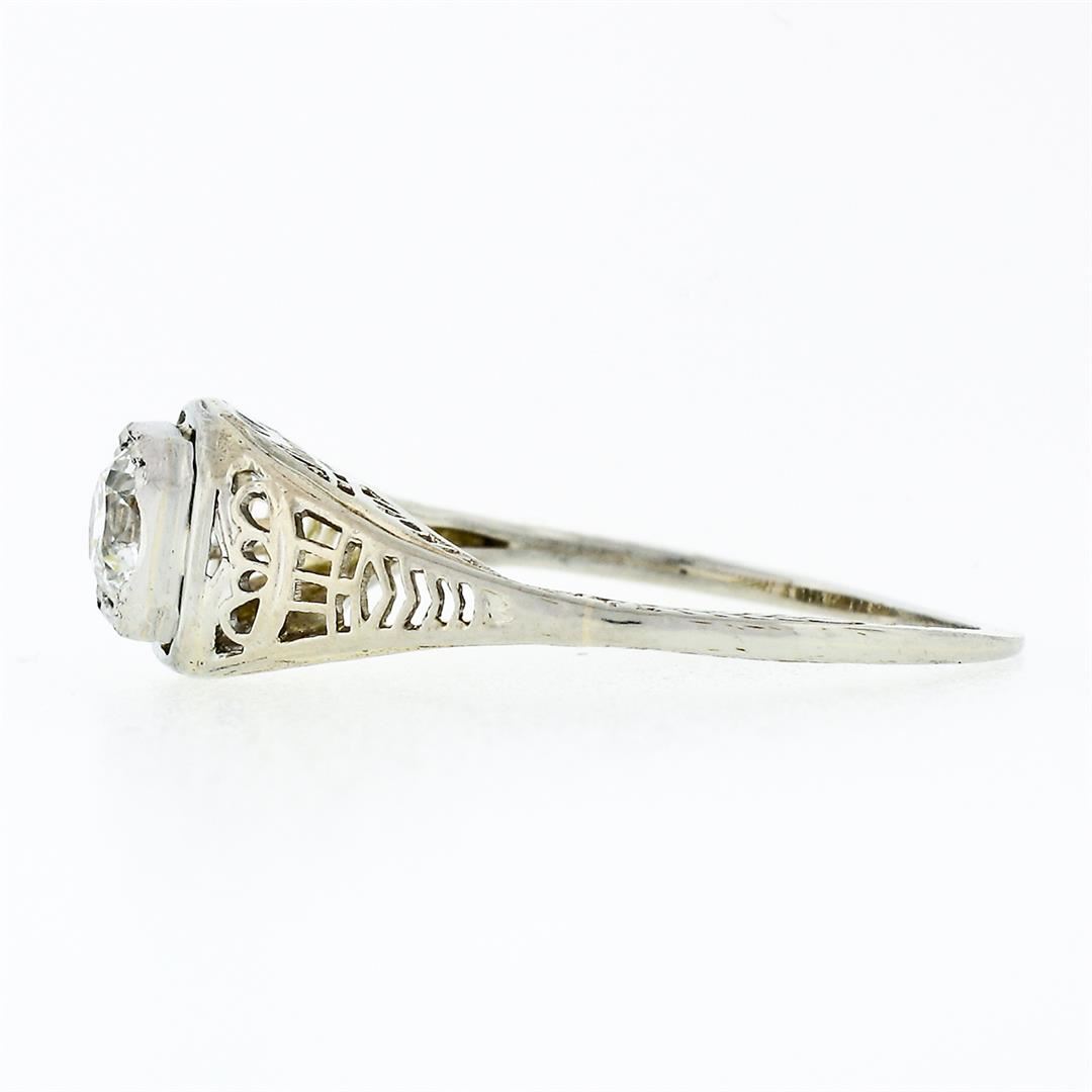 An art deco period 18k white gold filigree solitaire ring, with 1 old European cut natural diamond (H - VS1; 0.45ct). The ring is size 6.0, weighs a total of 1.94 grams, and measures 7.1mm wide.