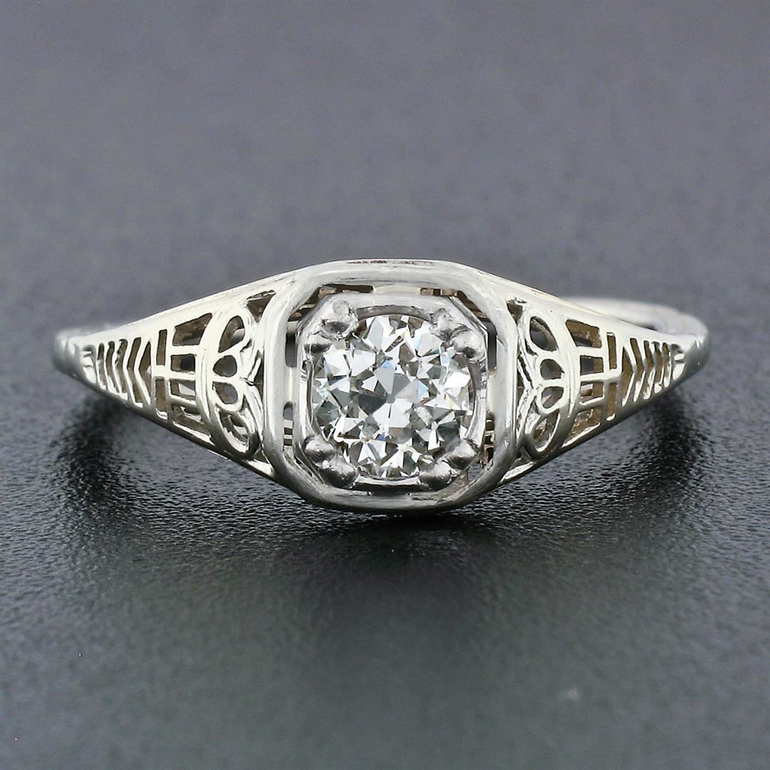An art deco period 18k white gold filigree solitaire ring, with 1 old European cut natural diamond (H - VS1; 0.45ct). The ring is size 6.0, weighs a total of 1.94 grams, and measures 7.1mm wide.
