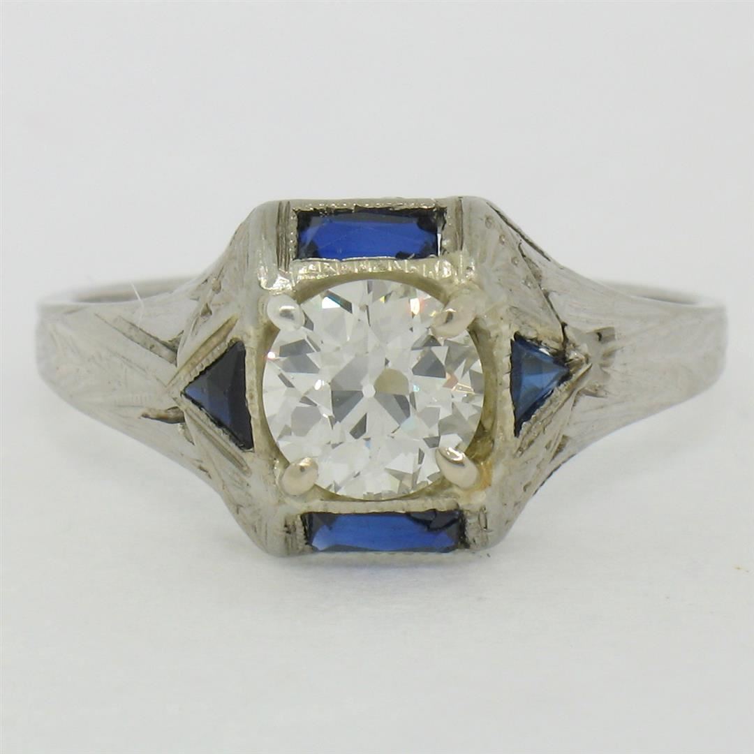 An excellent condition antique 18k white gold ring with a 0.65ct European cut diamond (H - VS1) accented by synthetic sapphires. The ring is size 5.5, weighs a total of 2.66 grams, and the top measures approximately 9.0mm wide.
