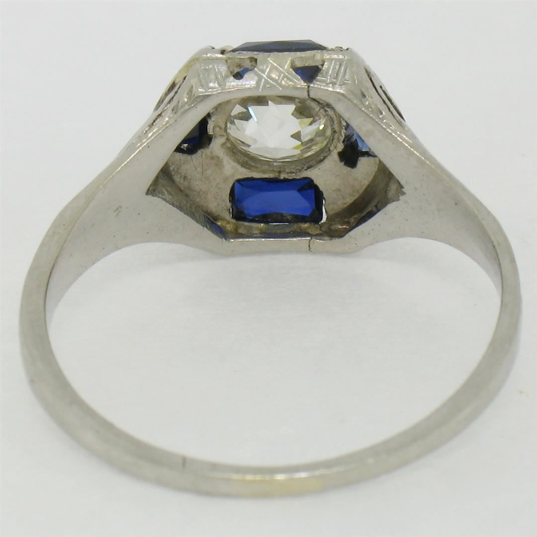 An excellent condition antique 18k white gold ring with a 0.65ct European cut diamond (H - VS1) accented by synthetic sapphires. The ring is size 5.5, weighs a total of 2.66 grams, and the top measures approximately 9.0mm wide.
