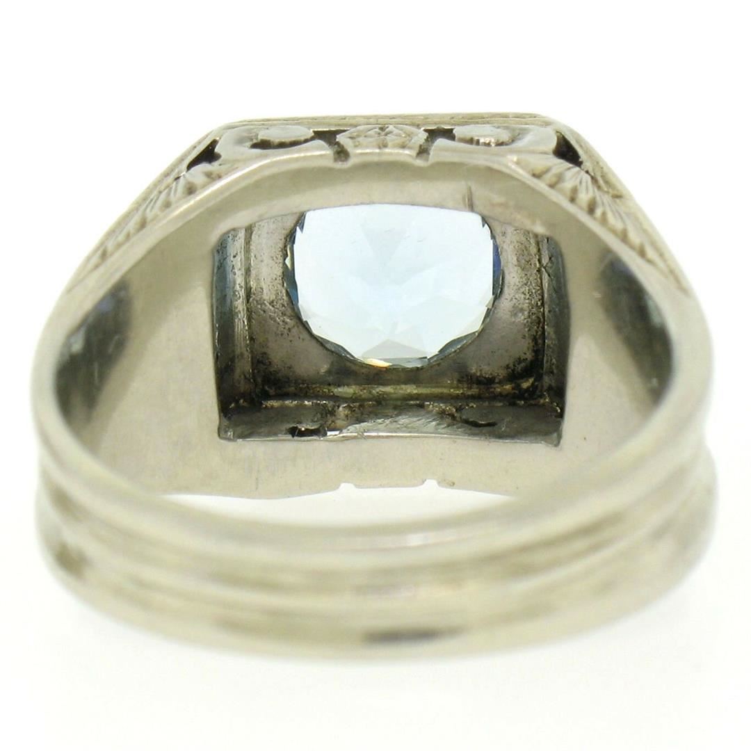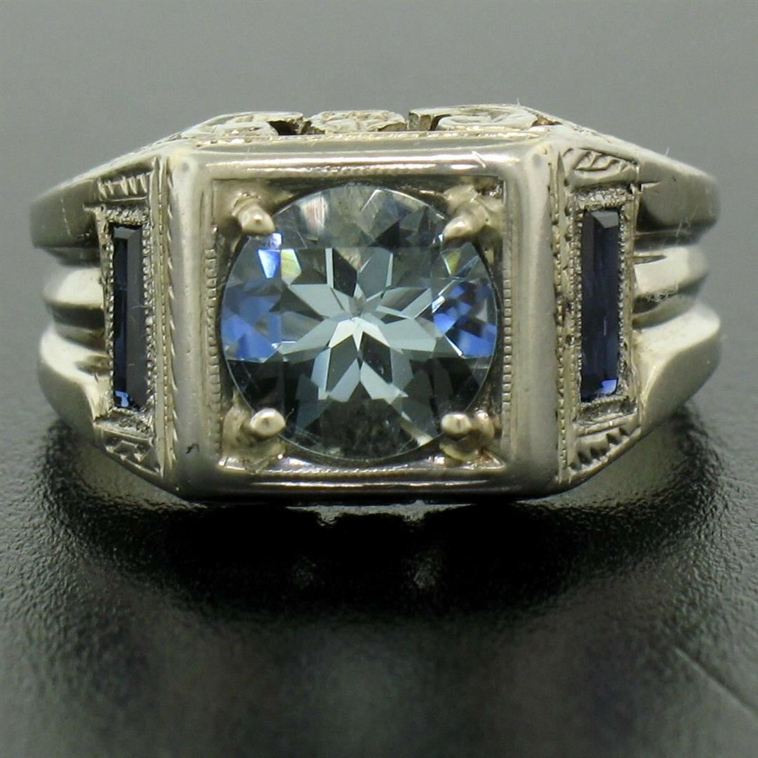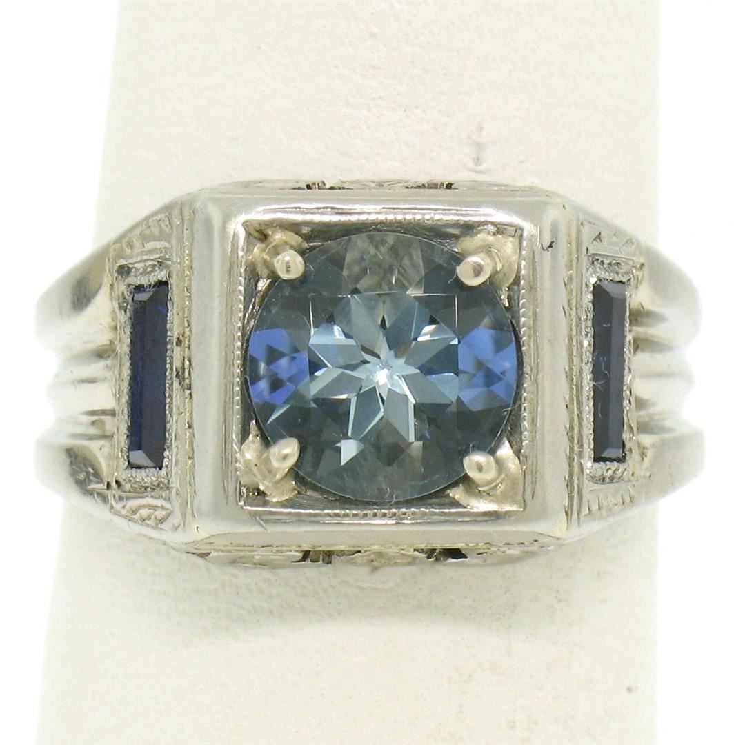 An excellent condition antique 18k white gold ring with a 1.25ct round aquamarine flanked by two synthetic sapphires. The ring is a size 6.0, weighs a total of 7.20 grams, and is 10.45mm wide.