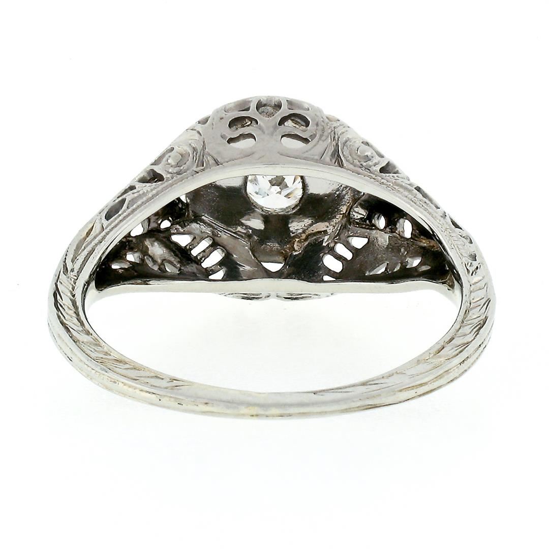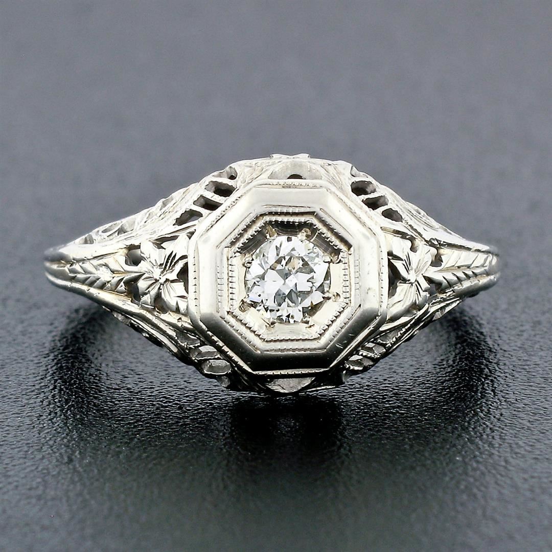 An antique solid 18k white gold engagement ring, with 1 old european cut natural diamond (G- SI1; 0.21ct). The ring is size 5.0, weighs a total of 2.66 grams, and measures 9.74mm wide.