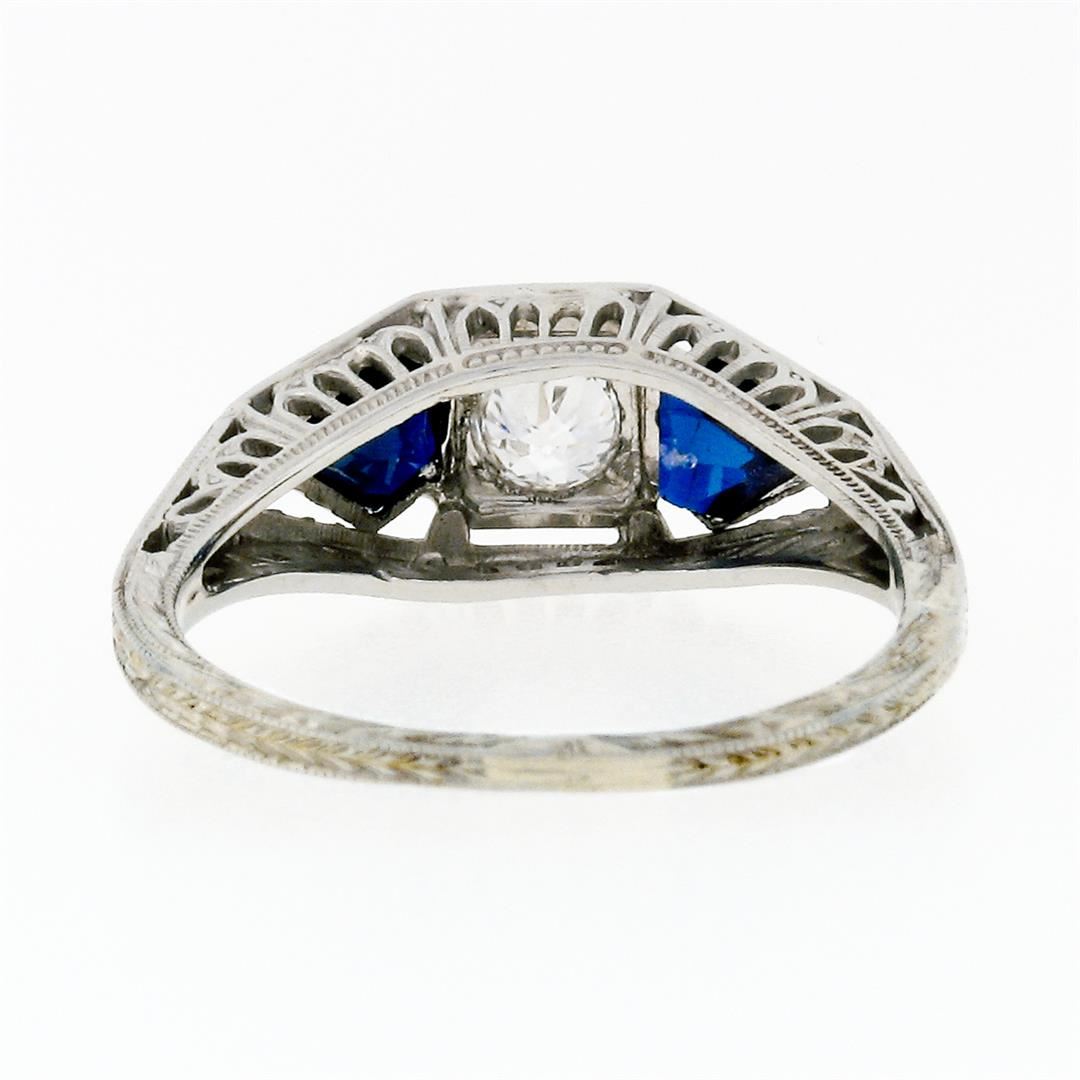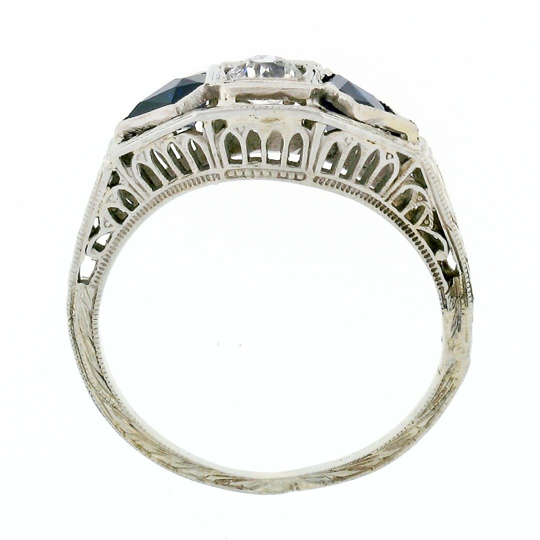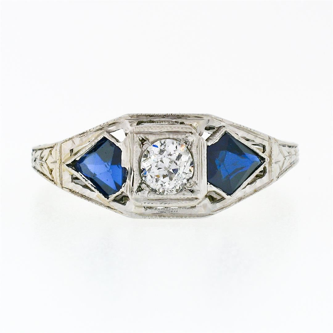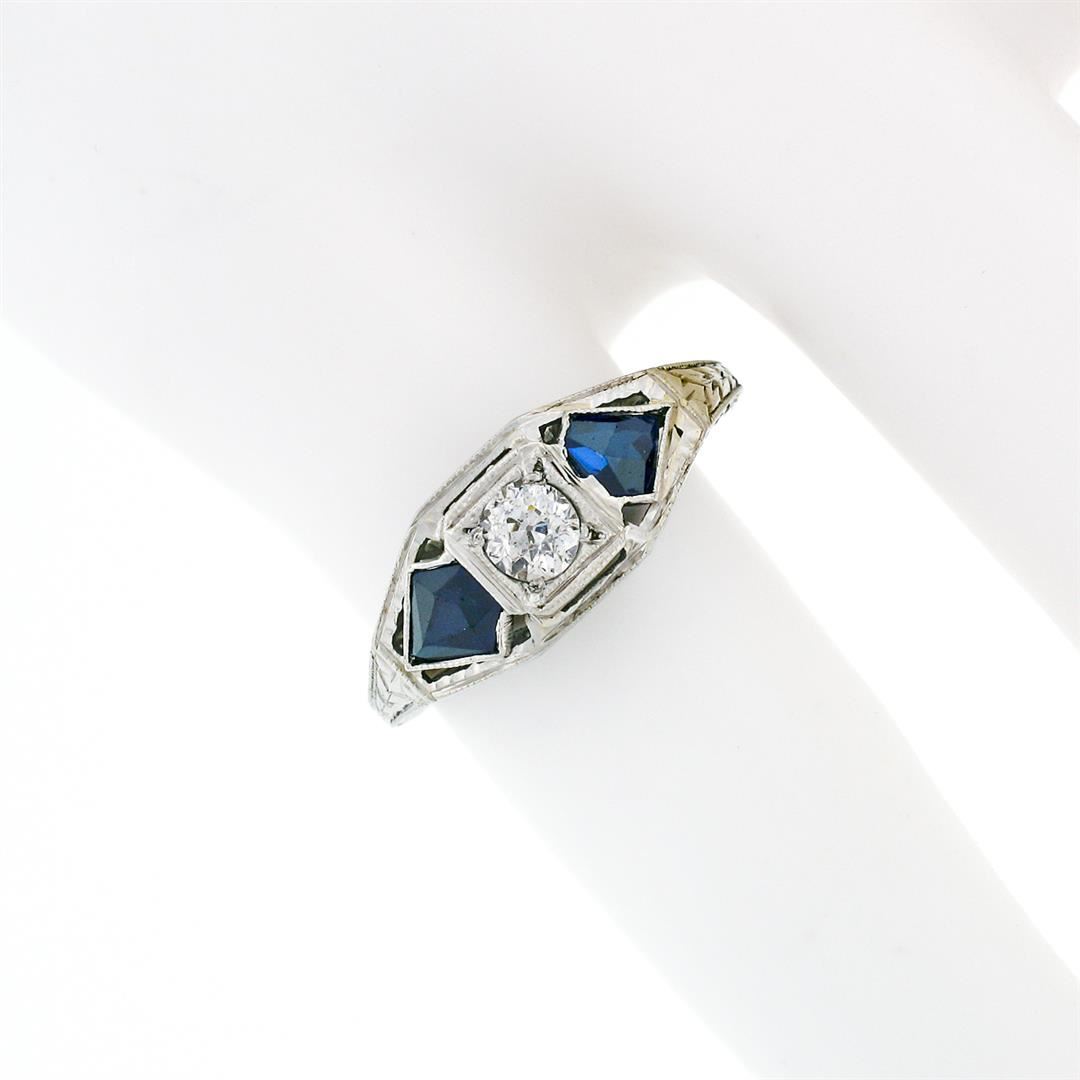 An art deco period solid 18k white gold ring with an old European cut natural diamond (G - SI2; 0.22ct)and 2 French cut deep blue synthetic sapphires. The ring is size 4.5, weighs a total of 2.13 grams, and measures 7.24mm wide.