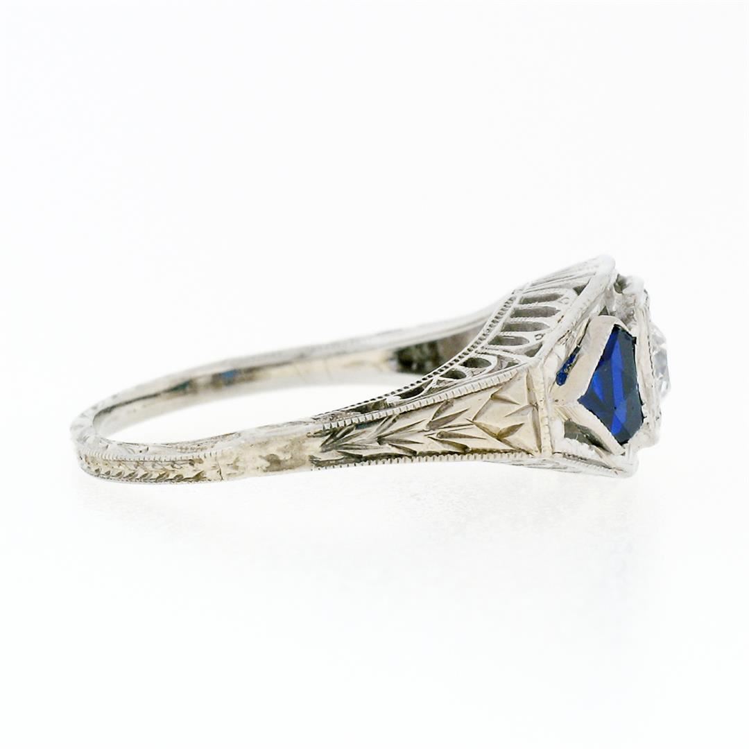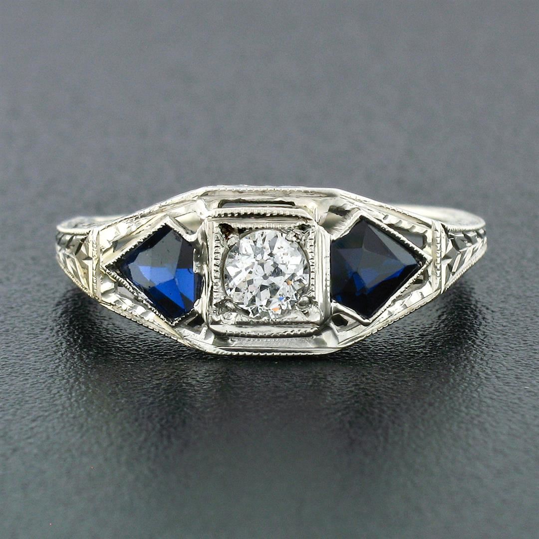 An art deco period solid 18k white gold ring with an old European cut natural diamond (G - SI2; 0.22ct)and 2 French cut deep blue synthetic sapphires. The ring is size 4.5, weighs a total of 2.13 grams, and measures 7.24mm wide.