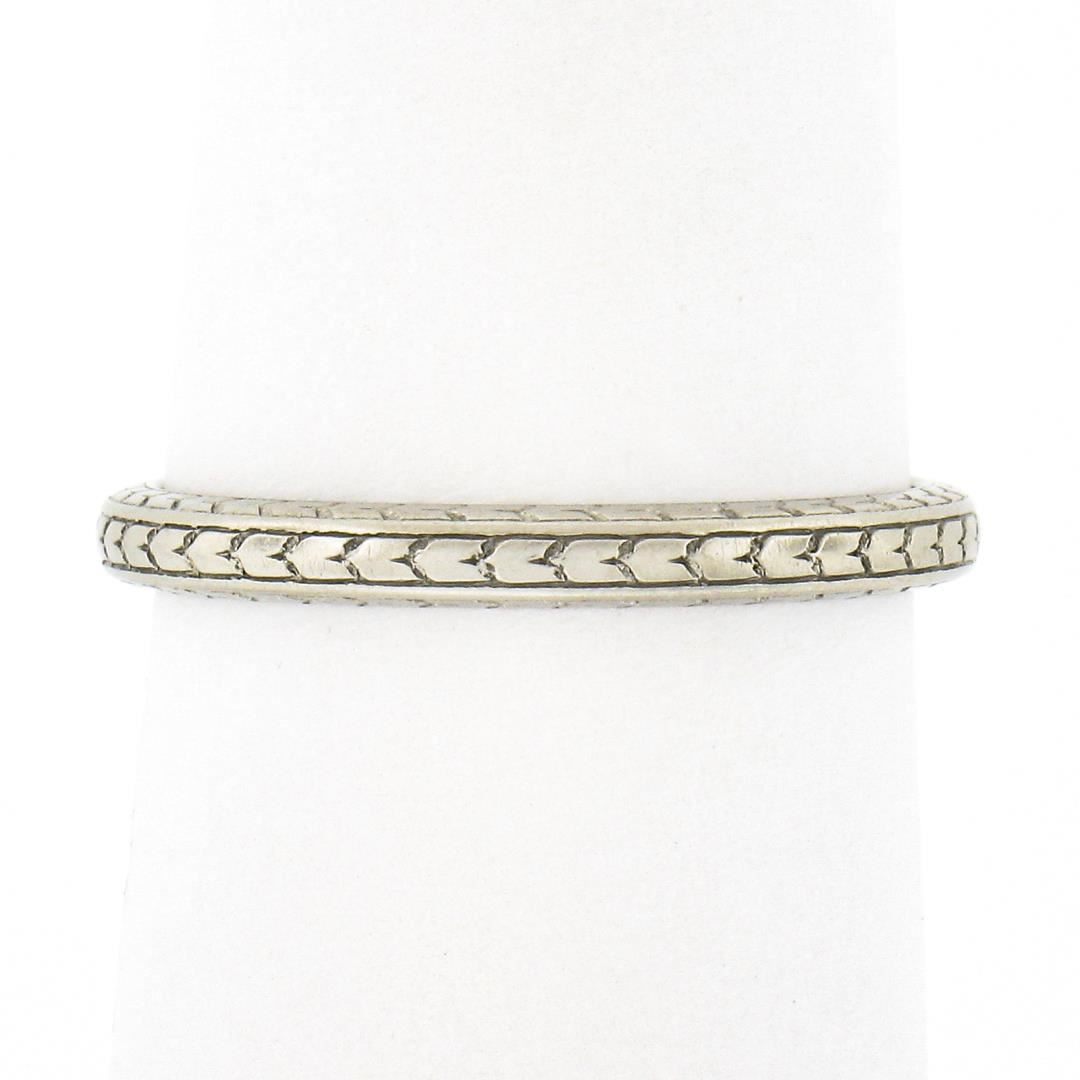 An antique solid 18k white gold band ring. The ring is size 6.5, weighs a total of 2.08 grams, and measures 2.25mm wide.