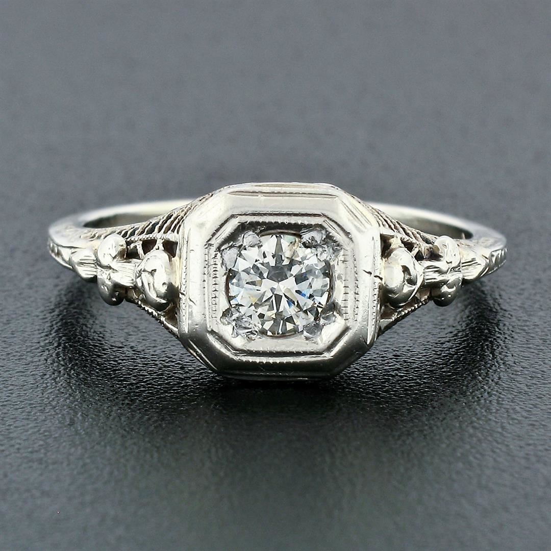 An art deco period solid 18k white gold filigree work engagement ring, with 1 old European cut natural diamond (G - SI1; 0.26ct). The ring is size 6.0, weighs a total of 2.30 grams, and measures 8mm wide.