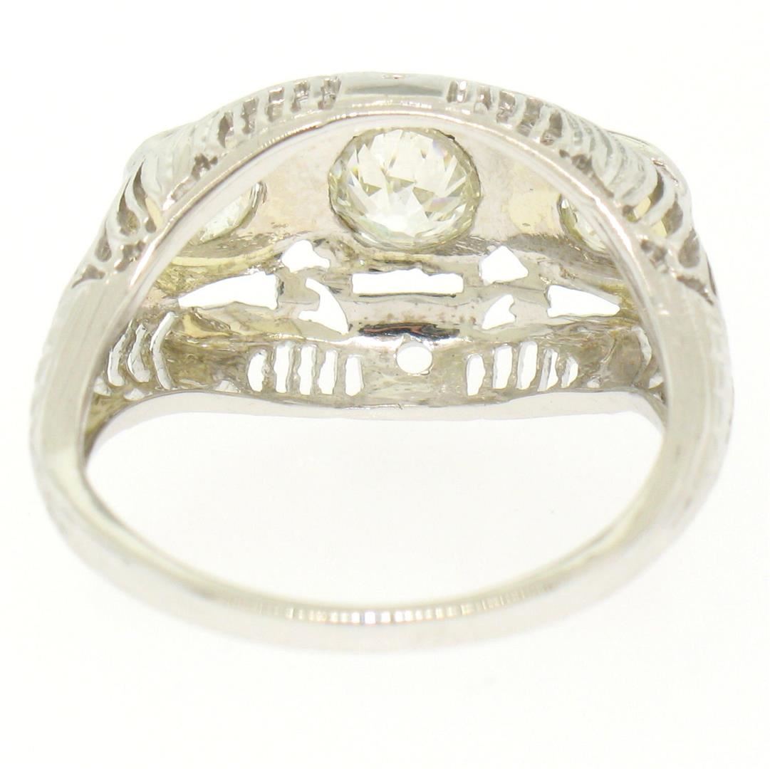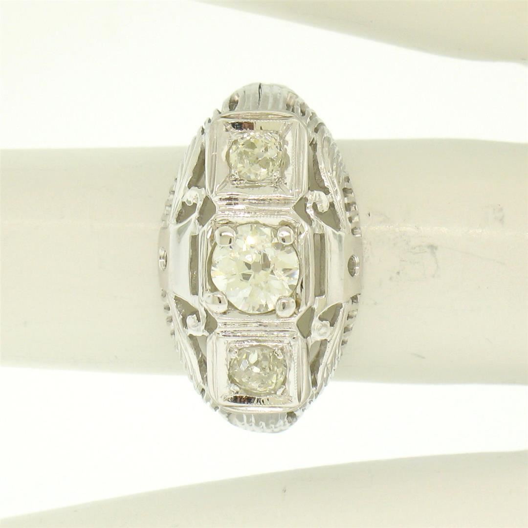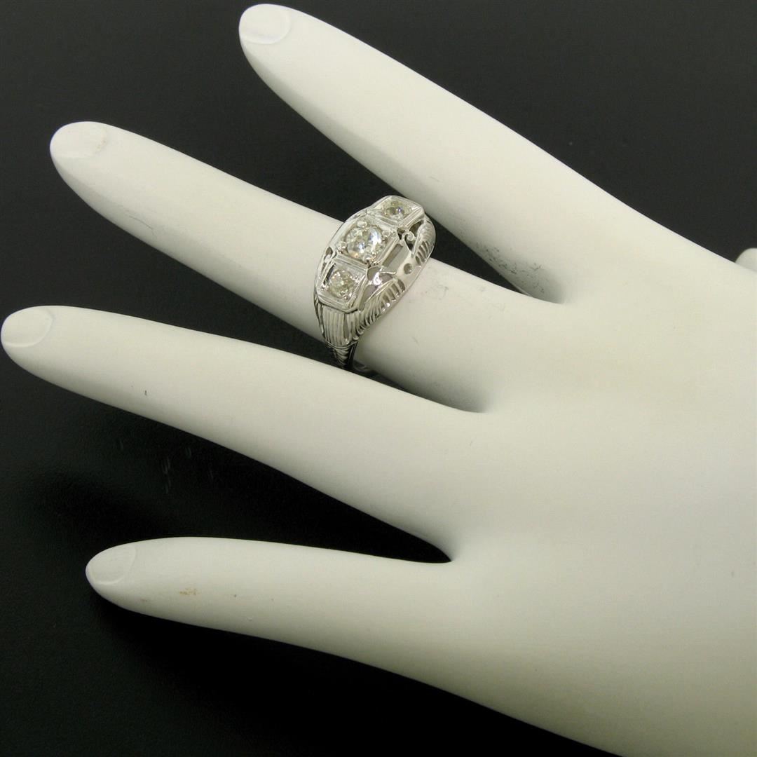 An antique solid 18k white gold 3 stones band ring, with 3 old european cut natural diamonds (I/J - VS2/SI1; 0.72ctw). The ring is size 5.0, weighs a total of 3.1 grams, and measures 11.21mm wide.