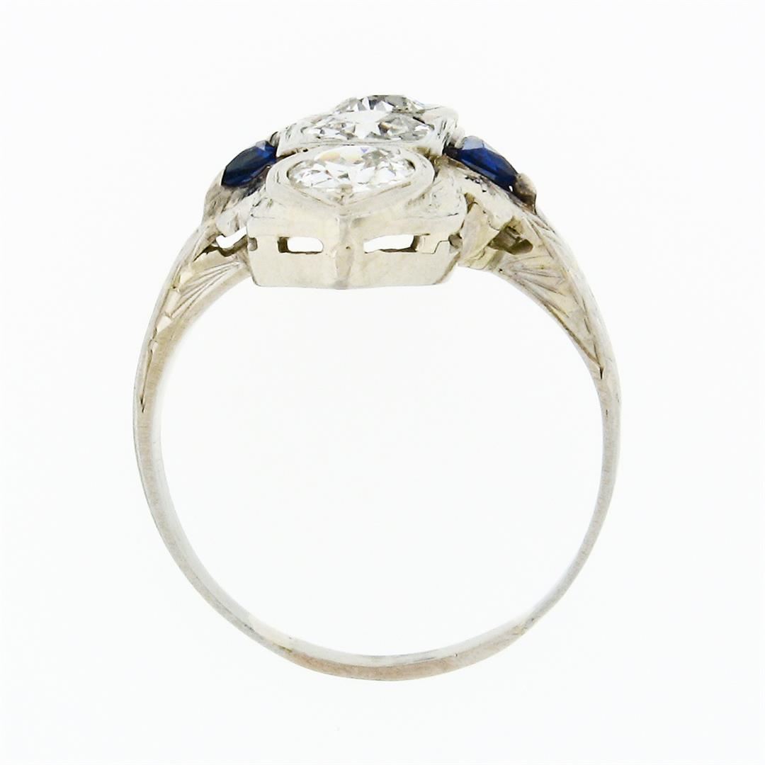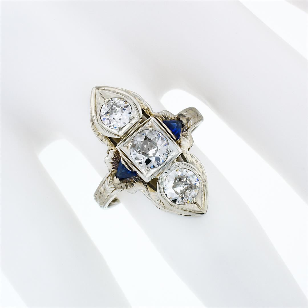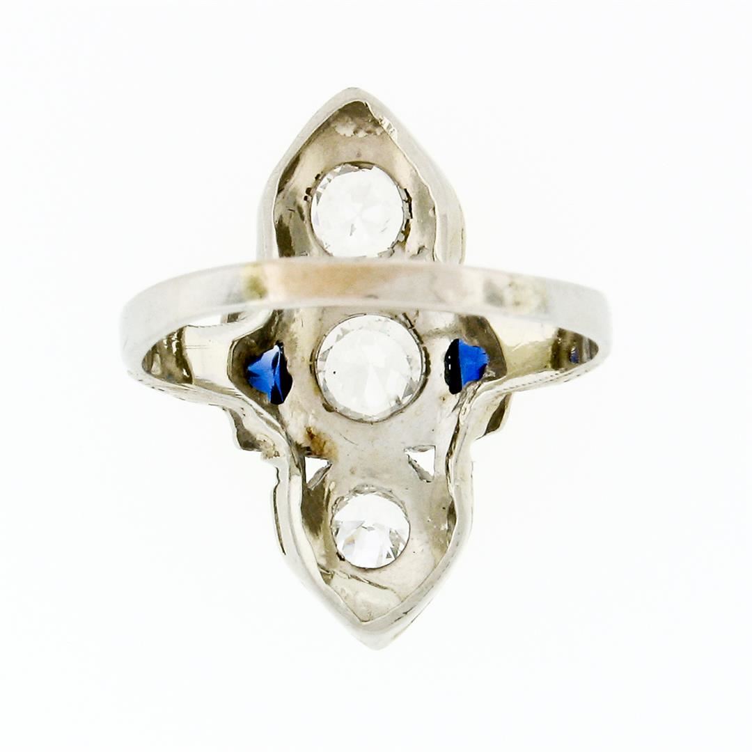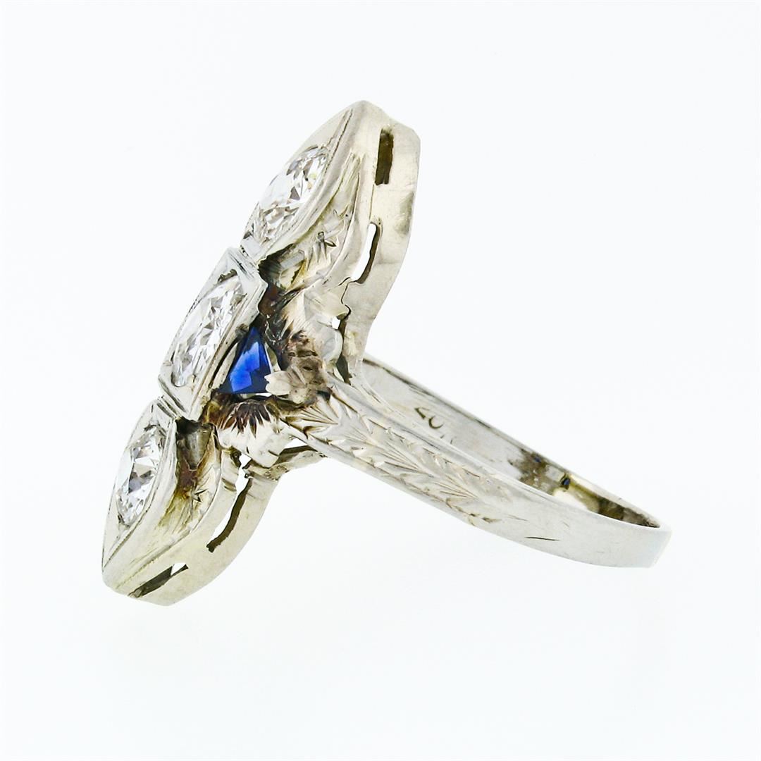 An antique art deco solid 20k white gold dinner ring, with 3 old european cut natural diamonds (G/H- VS2/SI1 ; 1.54ctw), and 2 triangular step cut synthetic sapphires.The ring is size 8, weighs a total of 4.82 grams, and measures 23.8mm wide.