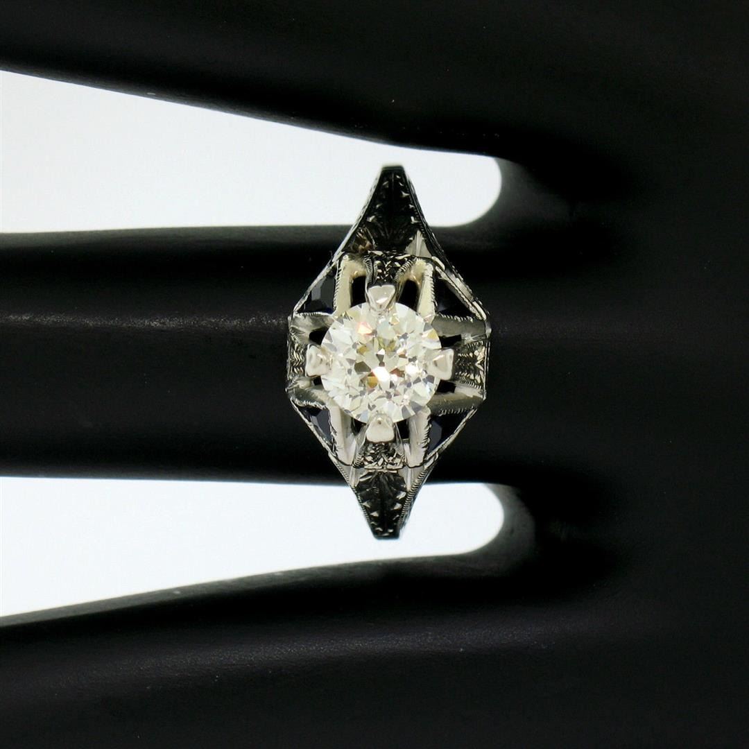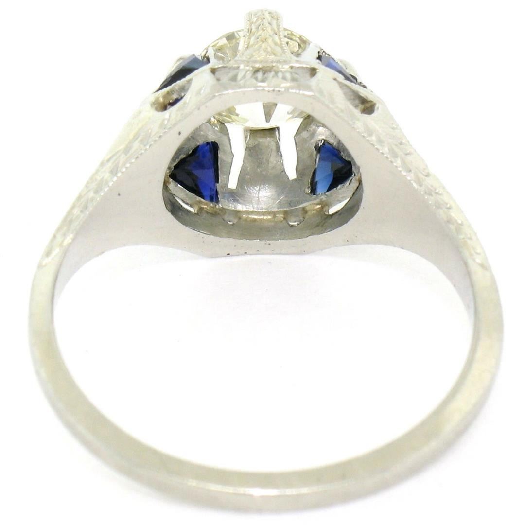 An excellent condition antique 20k white gold ring with a 0.95ct old European diamond (J - VS1) and accented with four triangular synthetic sapphires. The ring is a size 7, weighs a total of 4.05 grams, and is 10.45mm wide.