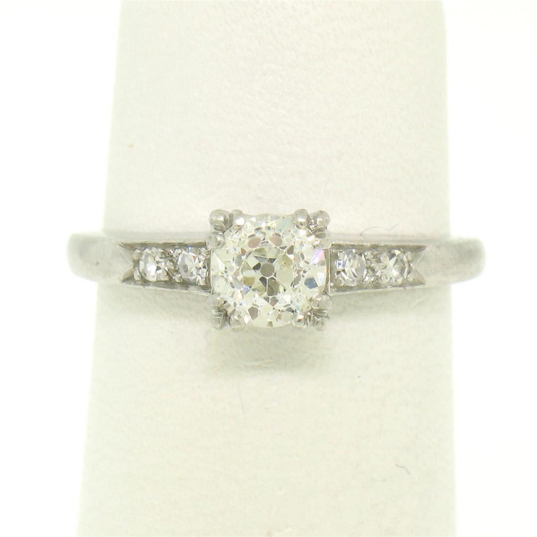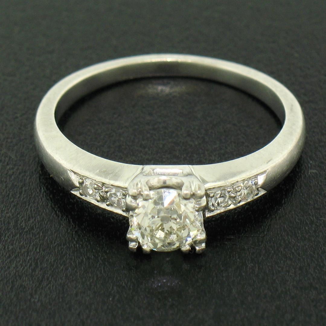 Antique Art Deco .900 Platinum 0.51ctw Old European Cut Diamond Engagement Ring. Please see photos and description for all available information. An antique art deco solid platinum solitaire engagement ring, featuring 1 round european cut natural diamond (I- VS2; 0.45ct), accented with 4 round single cut natural diamonds (I- VS2; 0.06ctw). The ring is size 4.5, weighs a total of 3.8 grams, and measures 5.10mm wide.