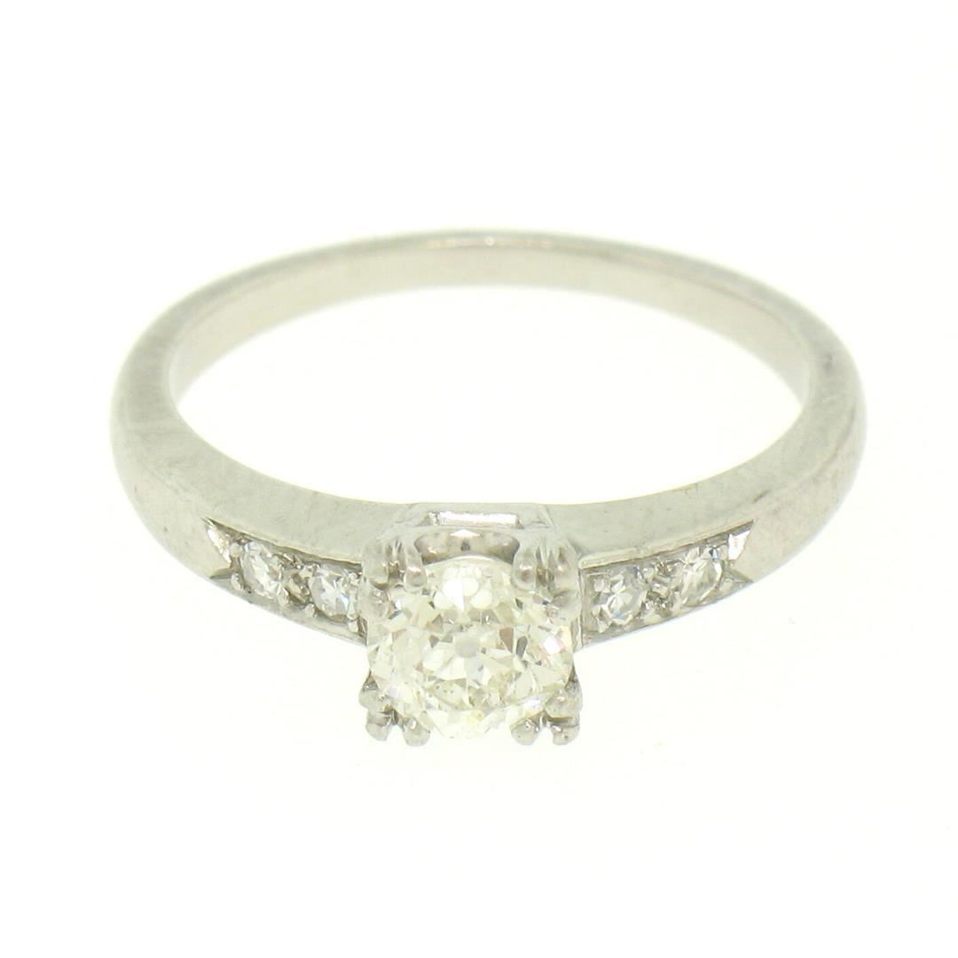 Antique Art Deco.900 Platinum 0.51ctw Old European Cut Diamond Engagement Ring. Please see photos and description for all available information. An antique art deco solid platinum solitaire engagement ring, featuring 1 round european cut natural diamond (I- VS2; 0.45ct), accented with 4 round single cut natural diamonds (I- VS2; 0.06ctw). The ring is size 4.5, weighs a total of 3.8 grams, and measures 5.10mm wide.
