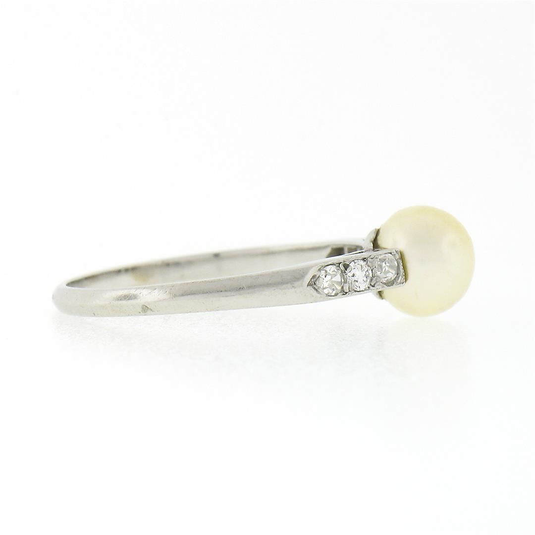 An antique art deco solid platinum solitaire ring, with 1 round shape cultured pearl (5.9mm), & 6 old single cut natural diamonds (G/H - VS1/VS2 ; 0.15ctw). The ring is size 5.5, weighs a total of 1.86 grams, and measures 5.9mm wide.