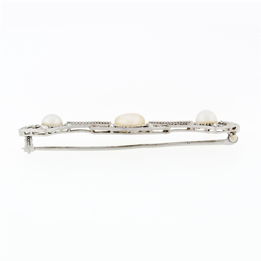 An antique art deco solid platinum bar pin brooch, with 1 round shape natural pearl (8.51x8.52mm), and 2 Gia certified button natural pearls (A) 5.83 x 3.77 mm - B) 6.29 x 4.16 mm), with 14 old european cut natural diamonds (F/G - VS1/VS2 ; 0.38ctw). Measures 12.52x61.22mm and weighs a total of 9.17 grams. Comes with all original relevant certifications.