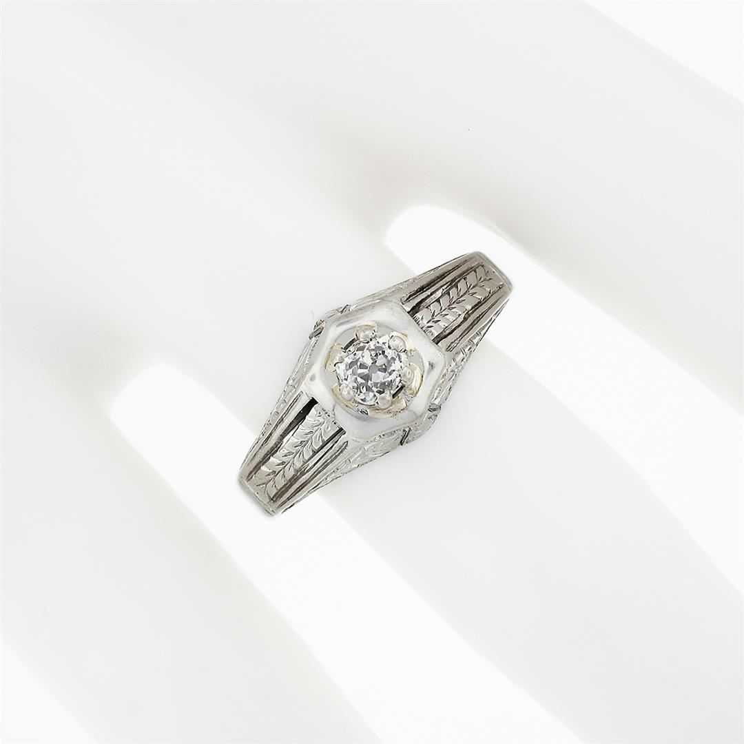 An antique art deco solid 18k white gold solitaire ring, with 1 old mine cut natural diamond (H - VS2 ; 0.32ct). The ring is size 8.5, weighs a total of 4.51 grams, and measures 9.03mm wide.