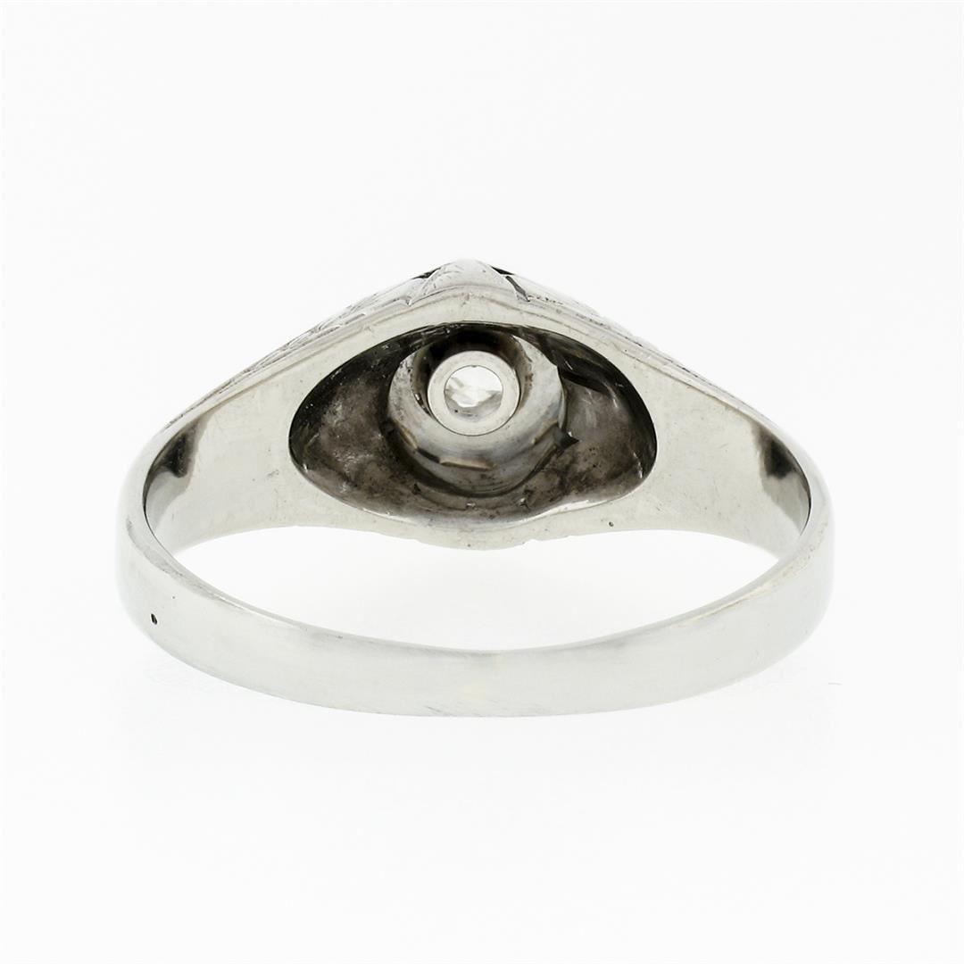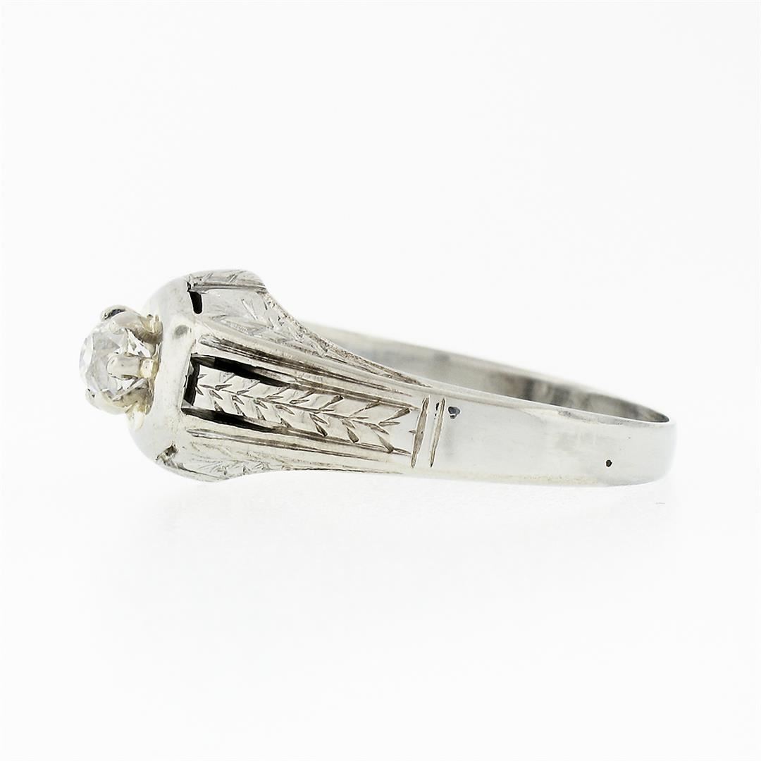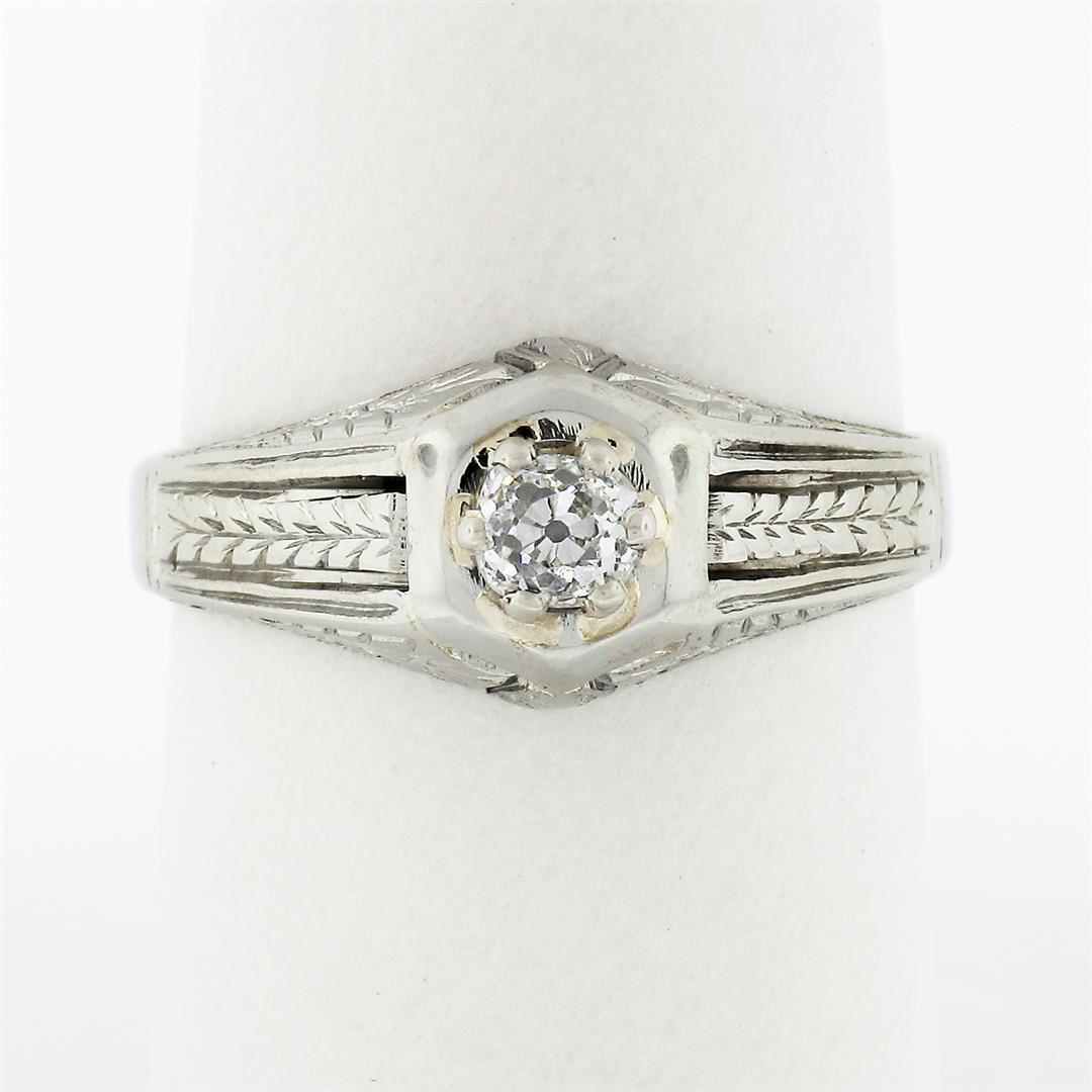 An antique art deco solid 18k white gold solitaire ring, with 1 old mine cut natural diamond (H - VS2 ; 0.32ct). The ring is size 8.5, weighs a total of 4.51 grams, and measures 9.03mm wide.