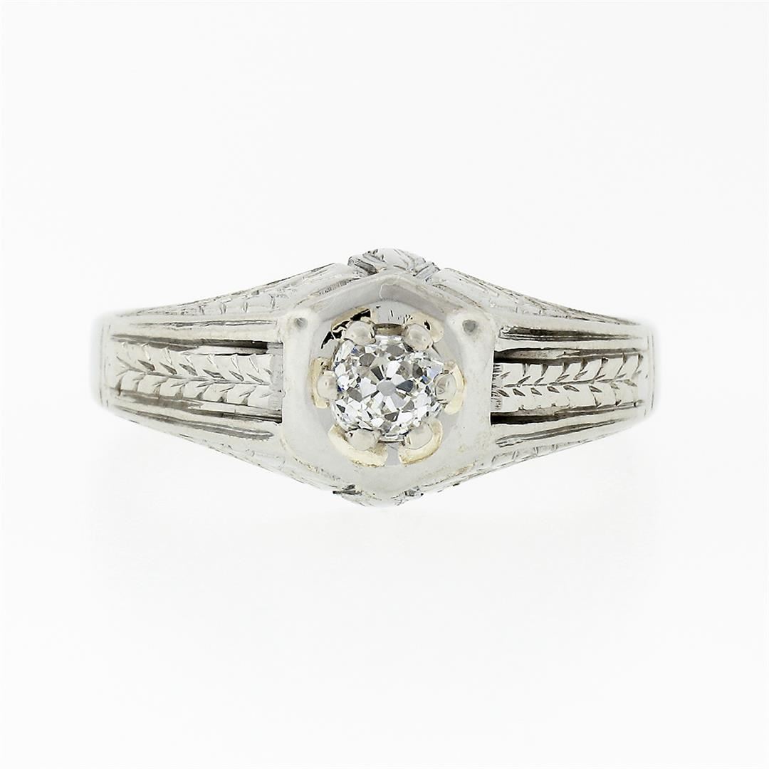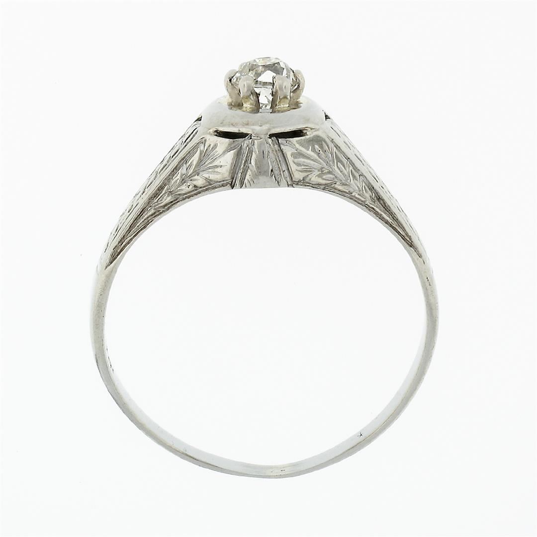 An antique art deco solid 18k white gold solitaire ring, with 1 old mine cut natural diamond (H - VS2 ; 0.32ct). The ring is size 8.5, weighs a total of 4.51 grams, and measures 9.03mm wide.