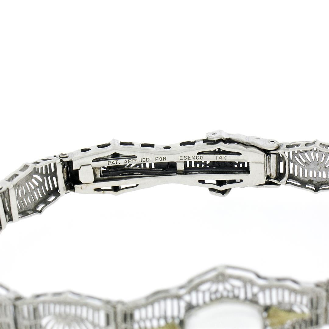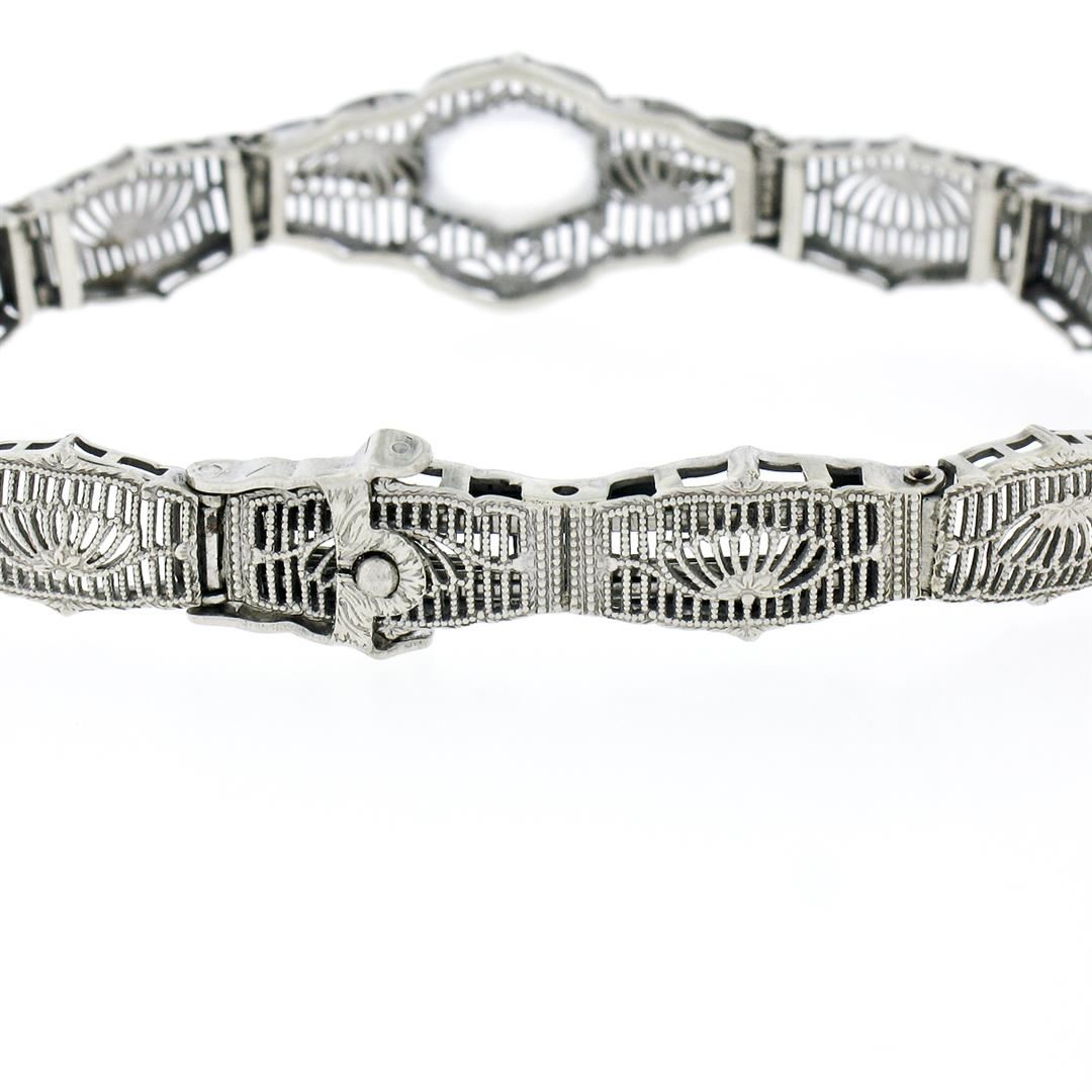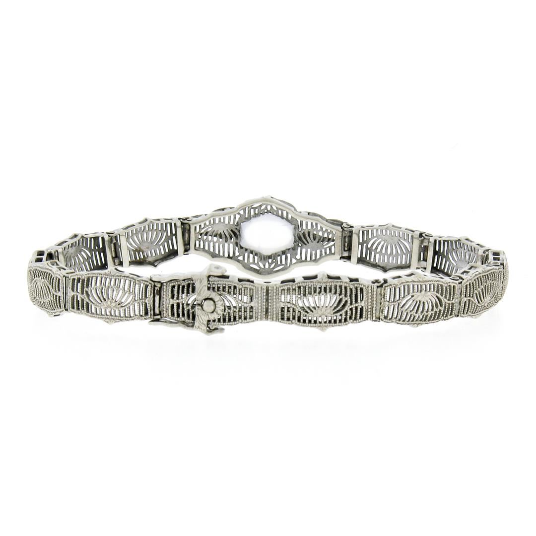 An antique art deco belly bracelet, with 1 oval cabochon cut natural moonstone (8.70x6.15mm). It weighs a total of 9.24 grams, measures 12.65mm wide, and measures 6.0 inches in length.