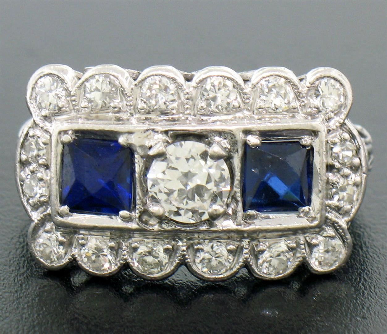 An antique solid platinum ring, with 2 square french cut natural synthetic sapphires (4.4mm), and 17 old european cut natural diamonds (G- VS1/VS2; 1.00ctw). The ring is size 6.0, weighs a total of 6.1 grams, and measures 12.0mm wide.