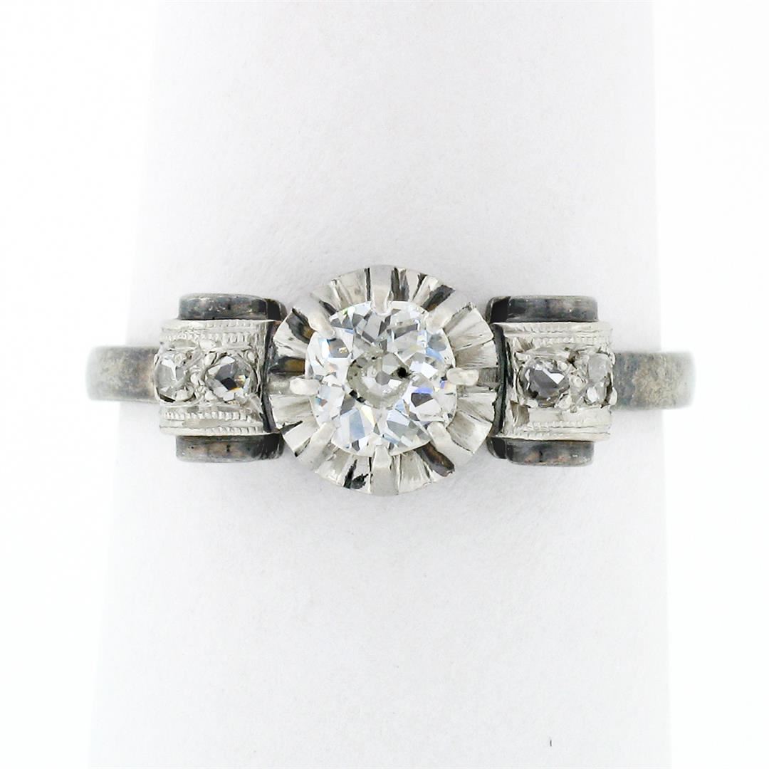An antique art deco french solid 18k white gold engagement ring, with 1 round cushion old mine cut natural diamond (H - SI2 ; 0.45ct ), accented with 4 old rose cut natural diamonds ( G/H - SI1/SI2 ; 0.08ctw). The ring is size 6.5, weighs a total of 2.56 grams, and measures 6.95mm wide.