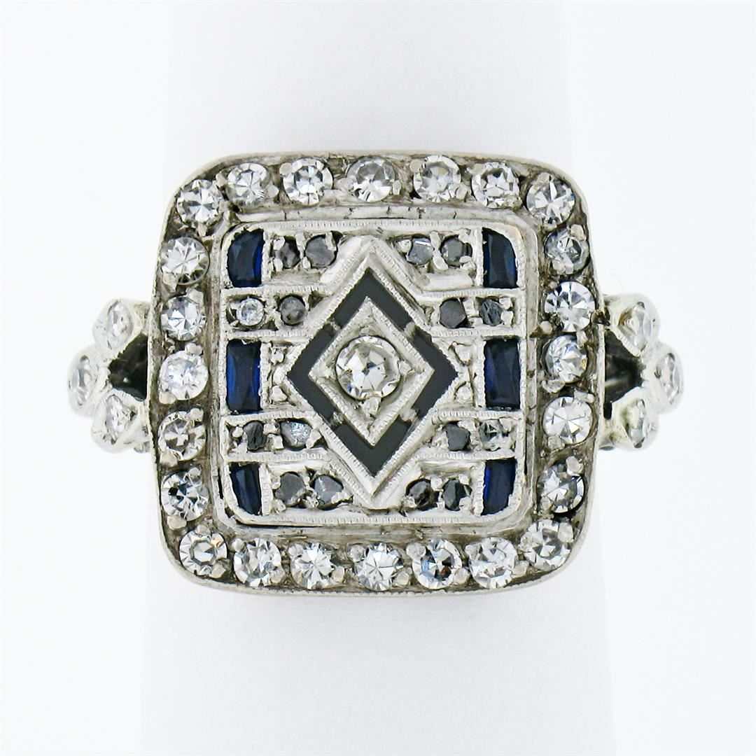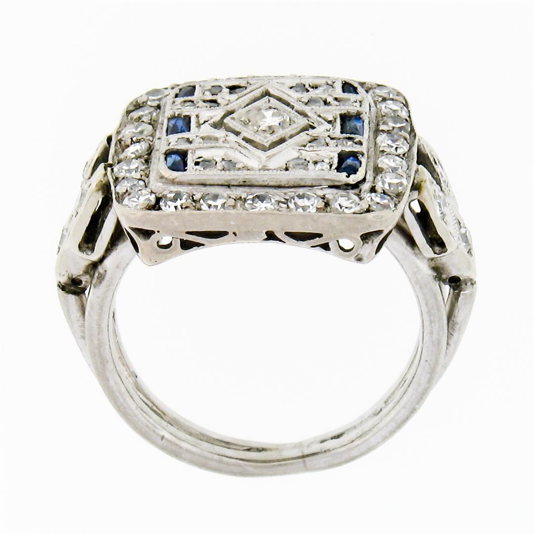 An anituqe solid 18k white gold french platter ring, with 31 old single cut natural diamonds (F/G - VS1/VS2 ; 1.0ctw), 16 old rose cut natural diamonds (0.16ctw), and 6 custom french cut natural sapphires. The ring is size 5.0, weighs a total of 5.62 grams, and measures 15.5mm wide.
