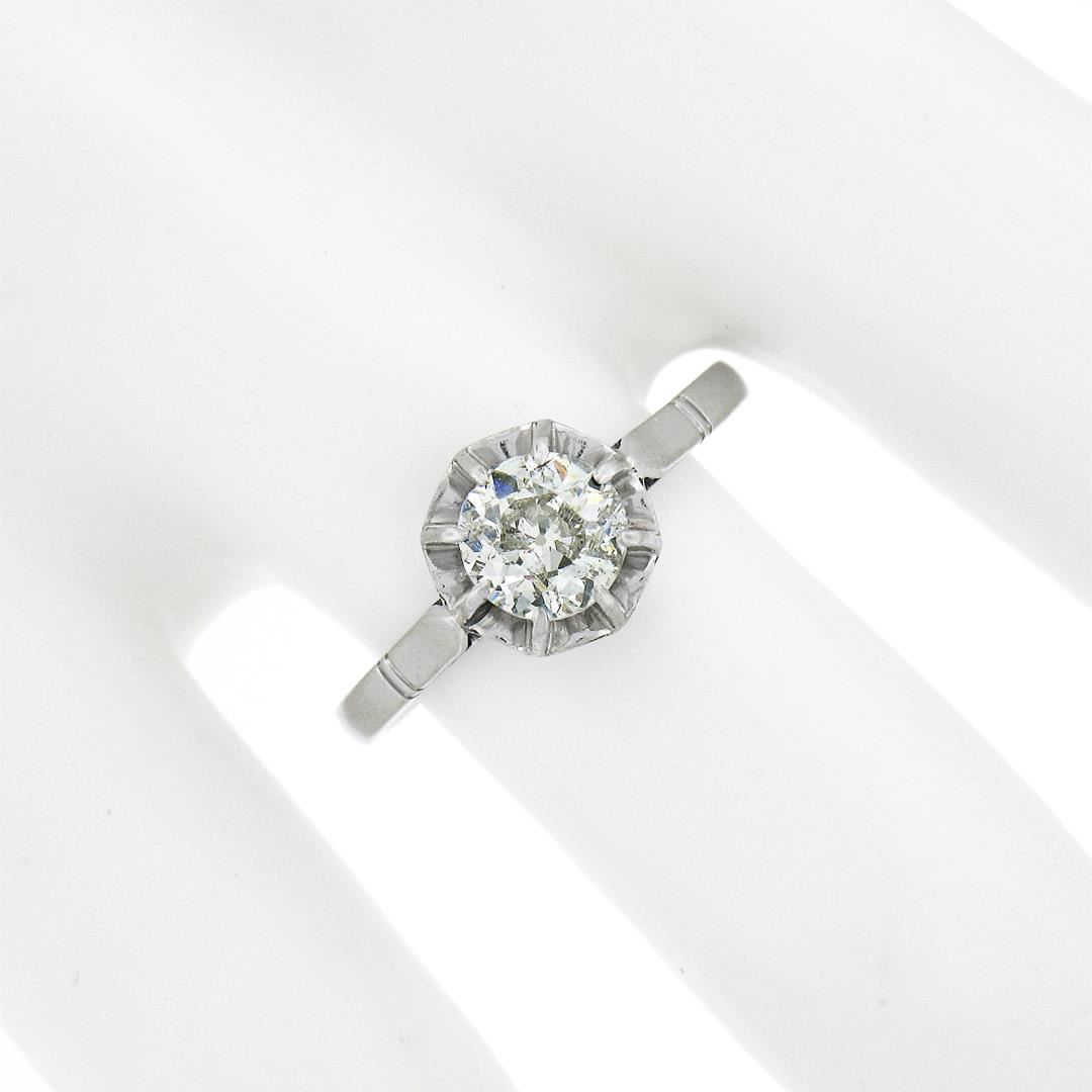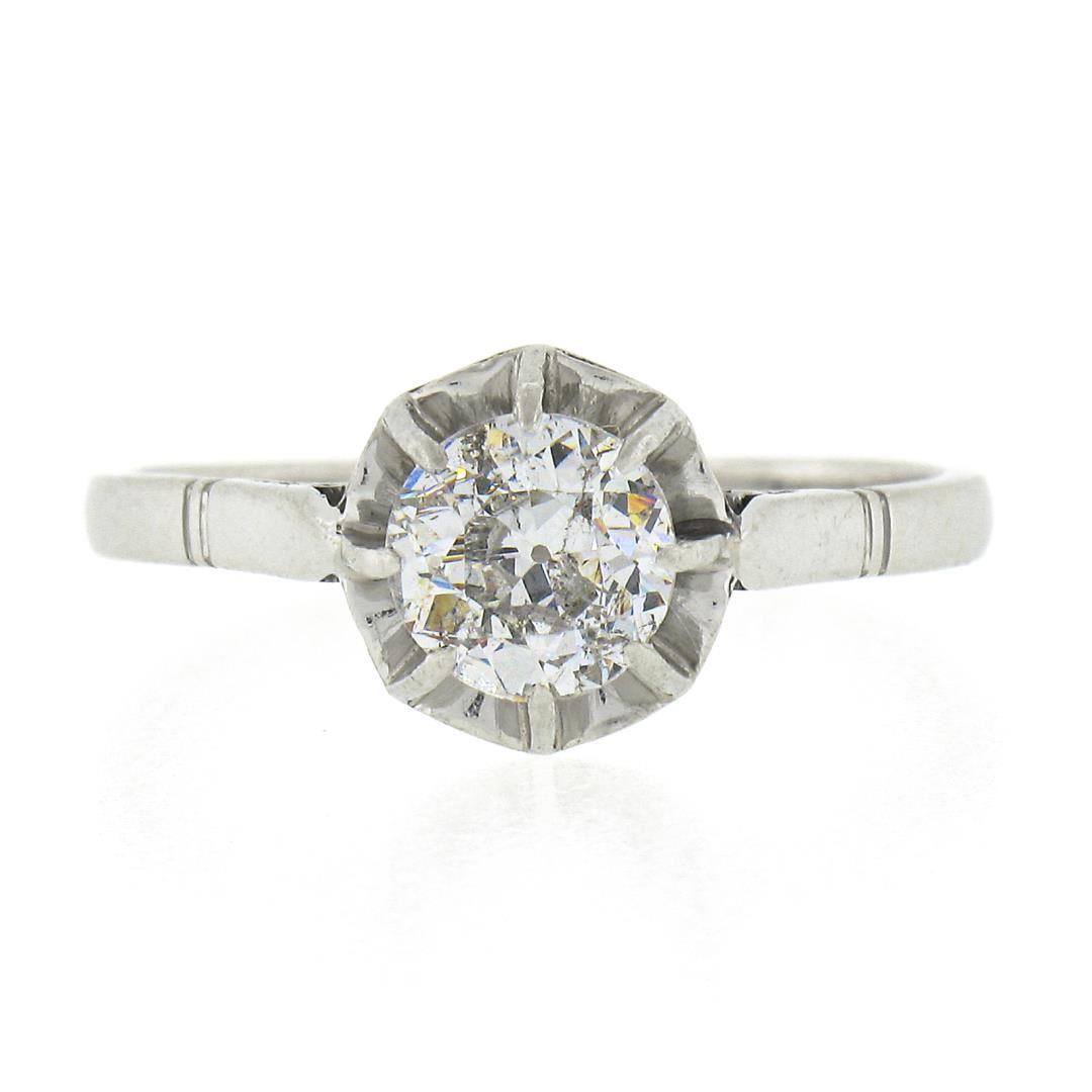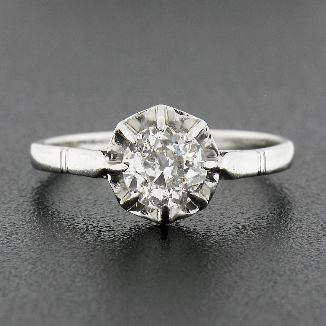 An antique solid platinum engagement ring, with 1 old european cut natural diamond (G - I1 ; 0.80ct). The ring is size 8.0, weighs a total of 3.22 grams, and measures 8.6mm wide.