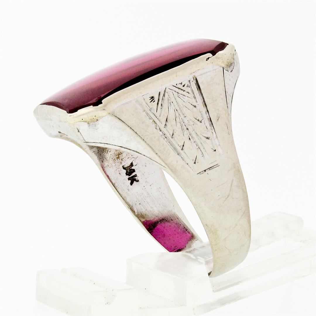 An antique art deco solid 14k white gold mens ring, with 1 rectangular cut synthetic red stone (19.6x14.9mm). The ring is size 11.5, weighs a total of 9.23 grams, and measures 21.04mm wide.