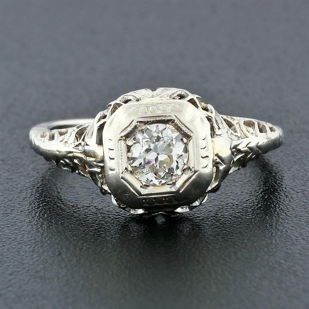 An art deco period solid 18k white gold filigree floral work promise ring with 1 old European cut natural diamond (I - VS2; 0.28ct). The ring is size 4.5, weighs a total of 1.56 grams, and measures 8.6mm wide.