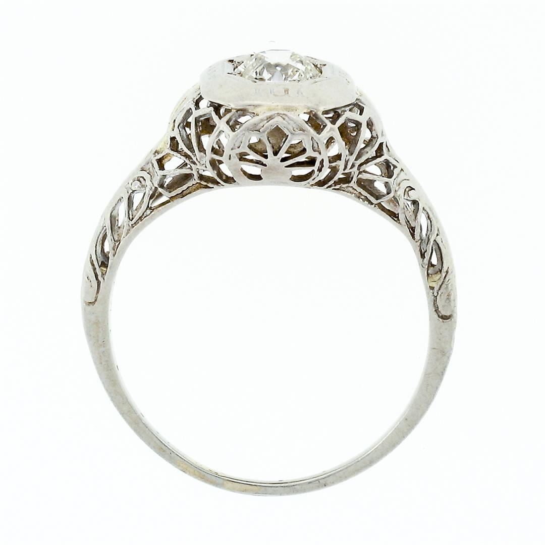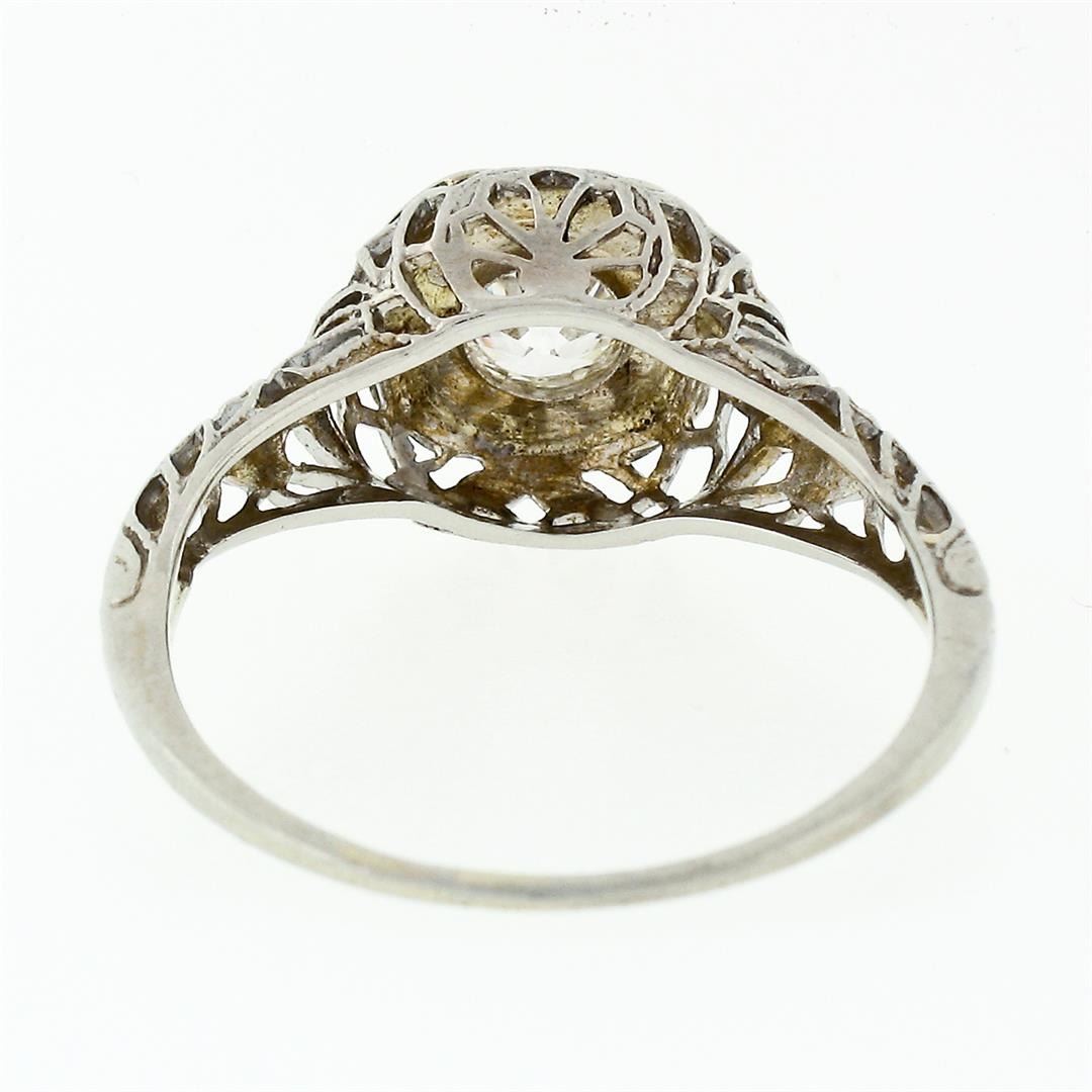 An art deco period solid 18k white gold filigree floral work promise ring with 1 old European cut natural diamond (I - VS2; 0.28ct). The ring is size 4.5, weighs a total of 1.56 grams, and measures 8.6mm wide.