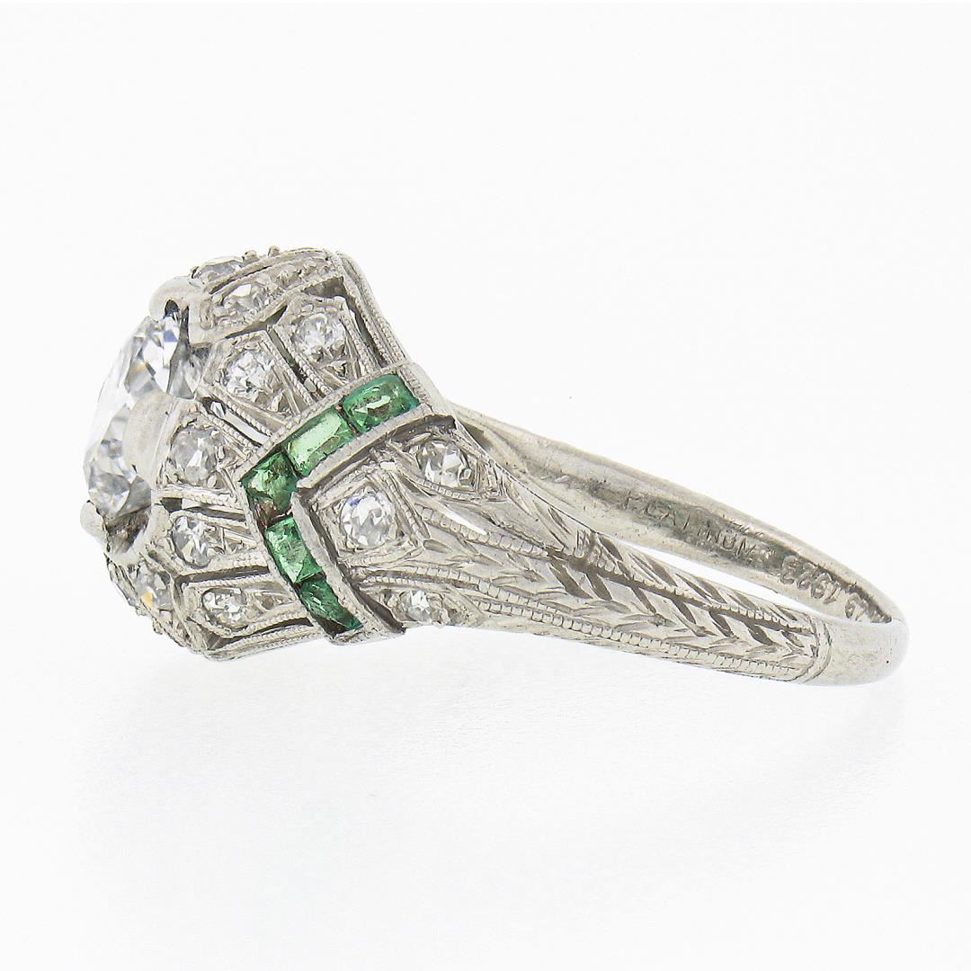 An antique art deco platinum ring, featuring 1 GIA graded old European cut natural diamond (E - VS2 ; 1.02ct), and 22 old single cut natural diamonds (G/H - VS1/VS2 ; 0.26ctw), with 10 square step cut natural emeralds (0.25ctw). The ring is size 7.5, weighs a total of 4.50 grams, and measures 12.10mm wide. Comes with all original relevant certifications.