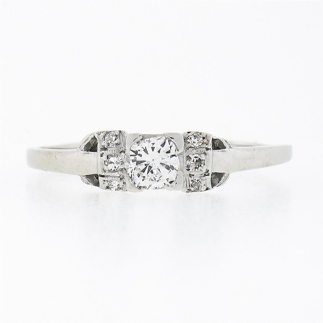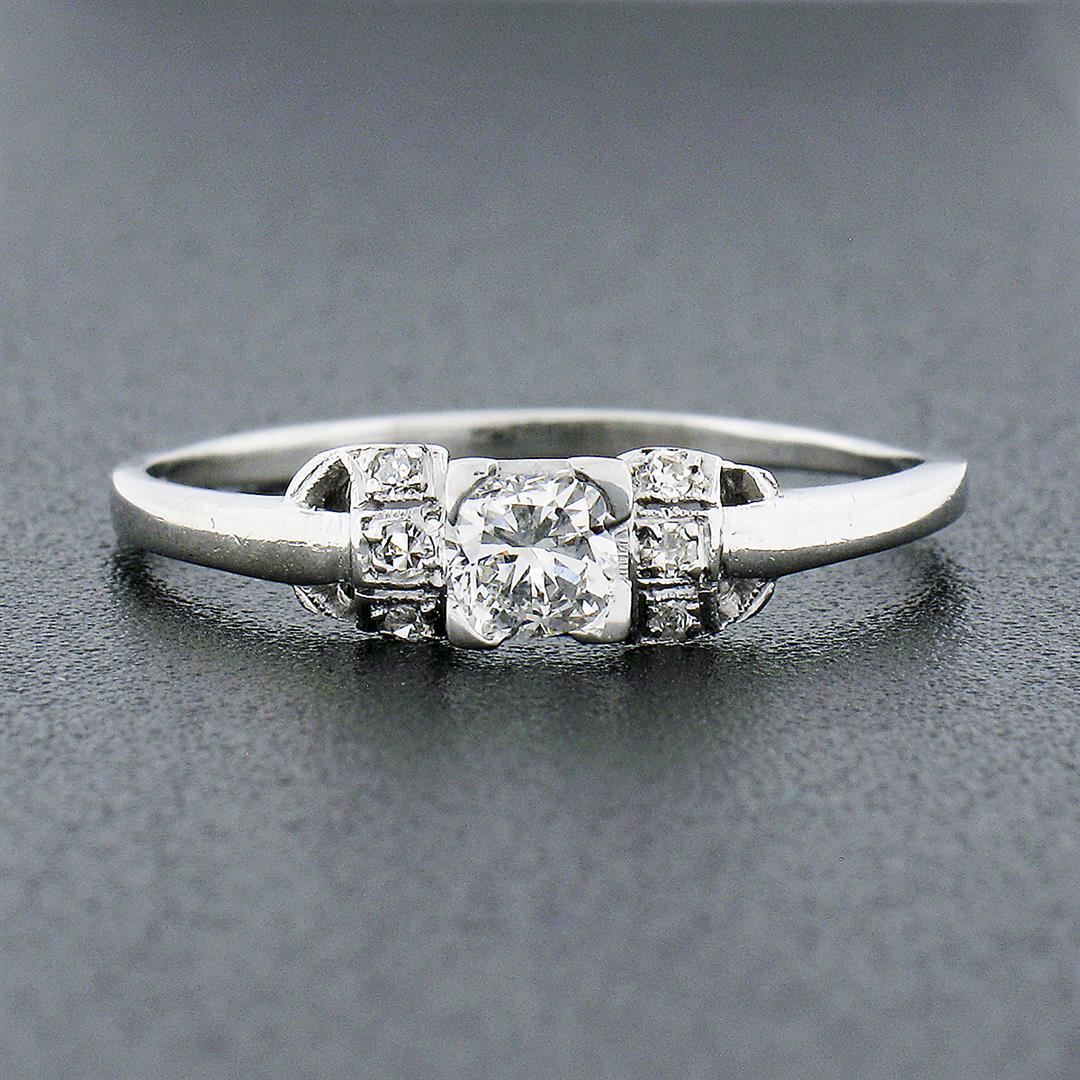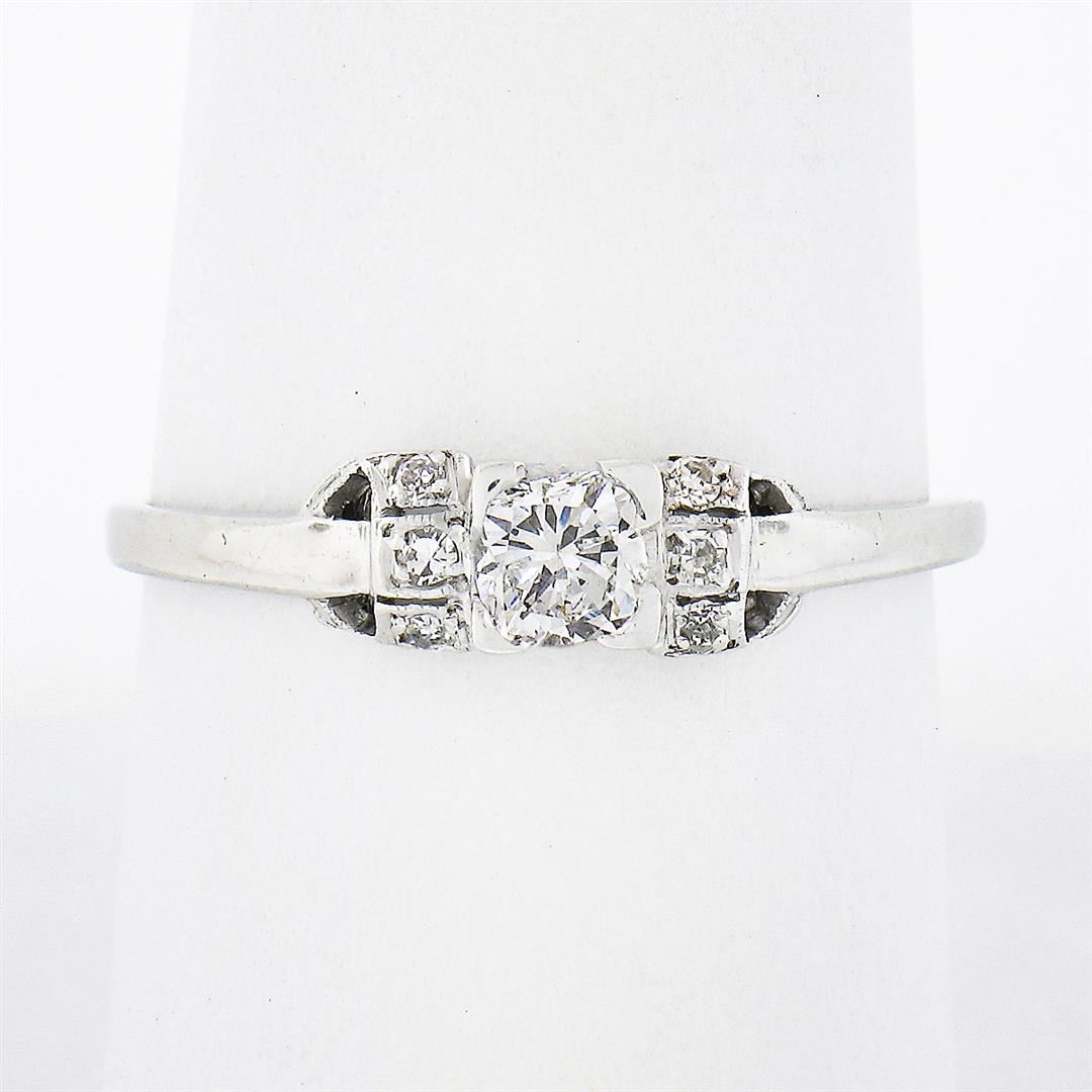 An antique solid platinum ring, with 1 old cushion cut natural diamond (G - VVS1 ; 0.26ct), and 6 old single cut natural diamonds (F/G - VS1/VS2 ; 0.06ctw). The ring is size 9.0, weighs a total of 2.40 grams, and measures 4.60mm wide.
