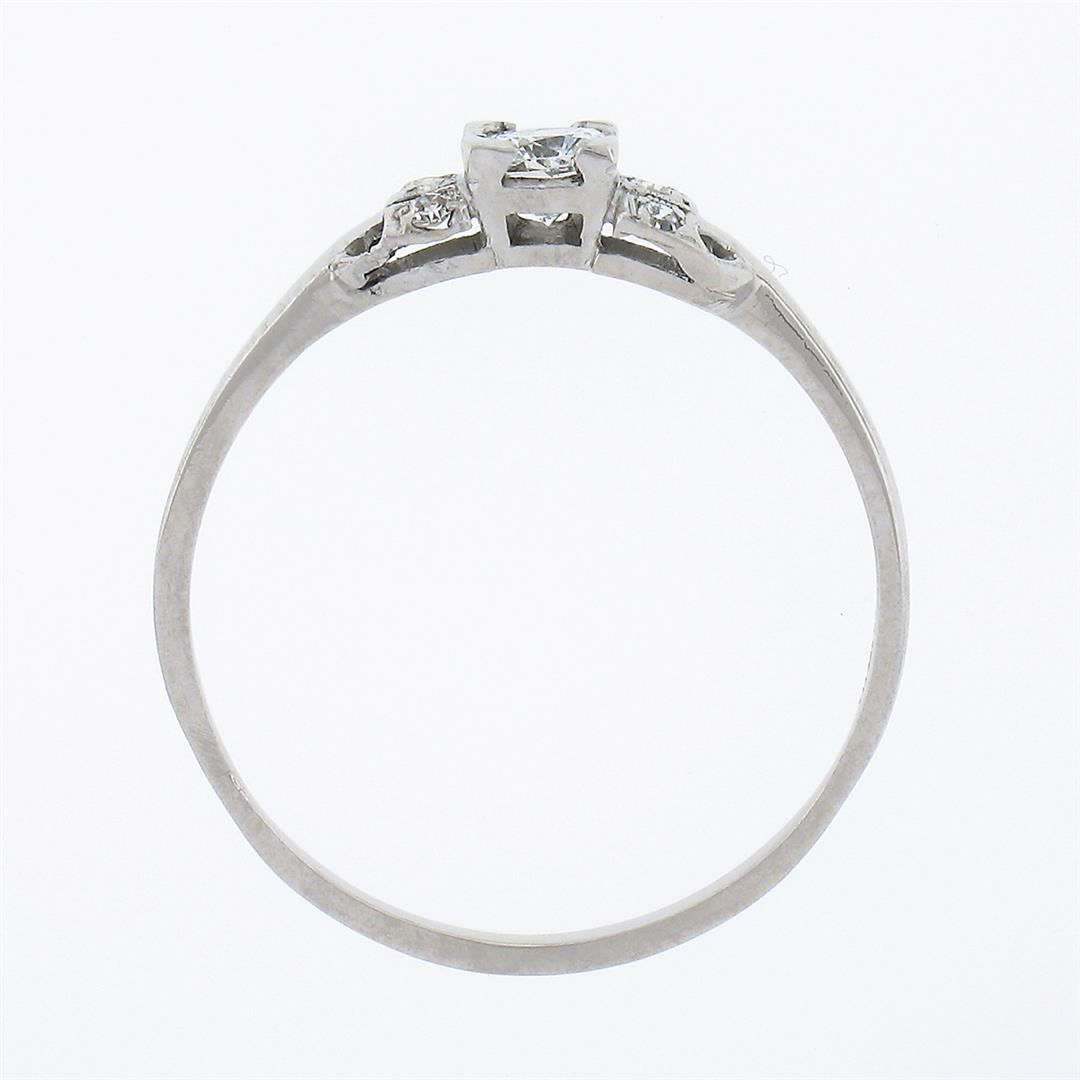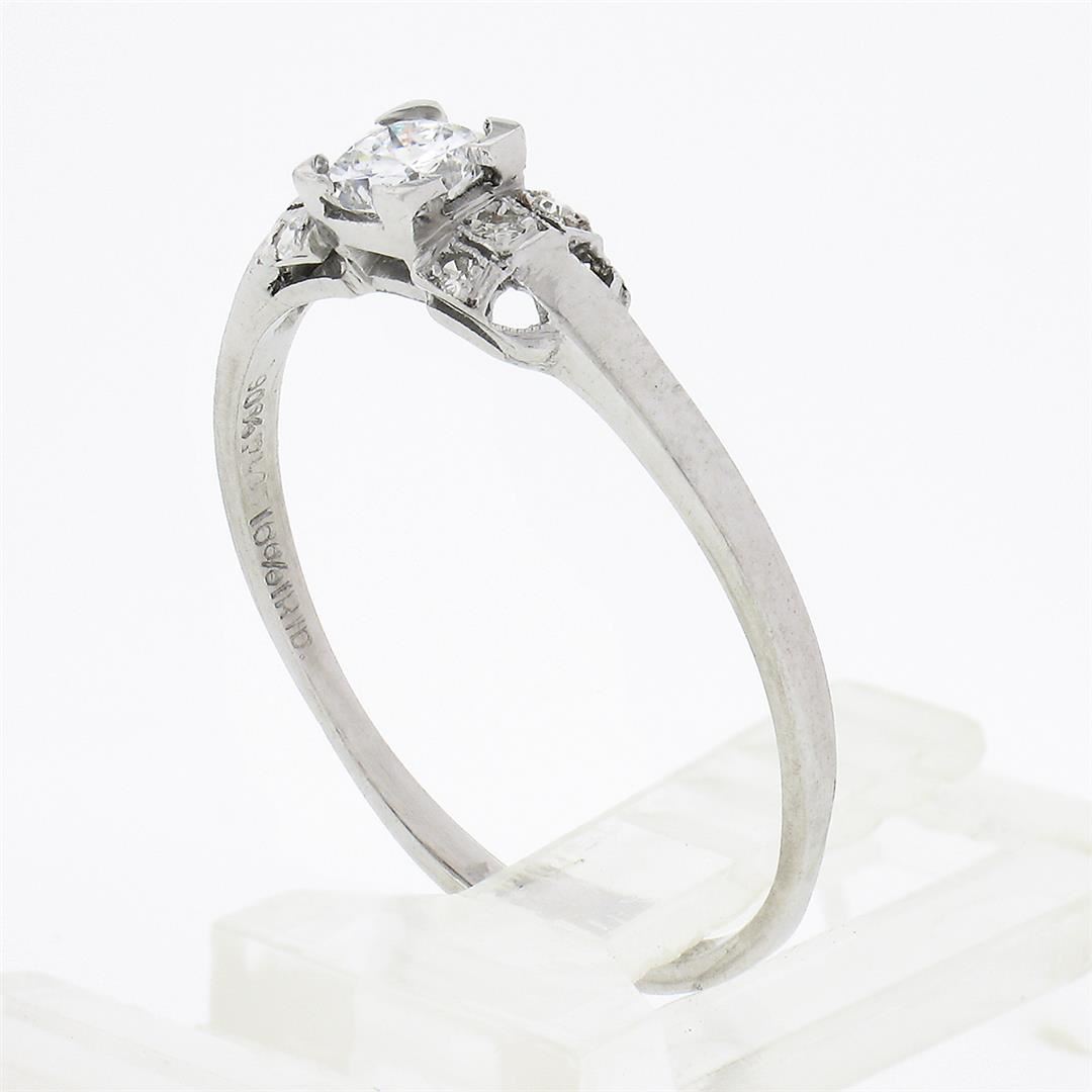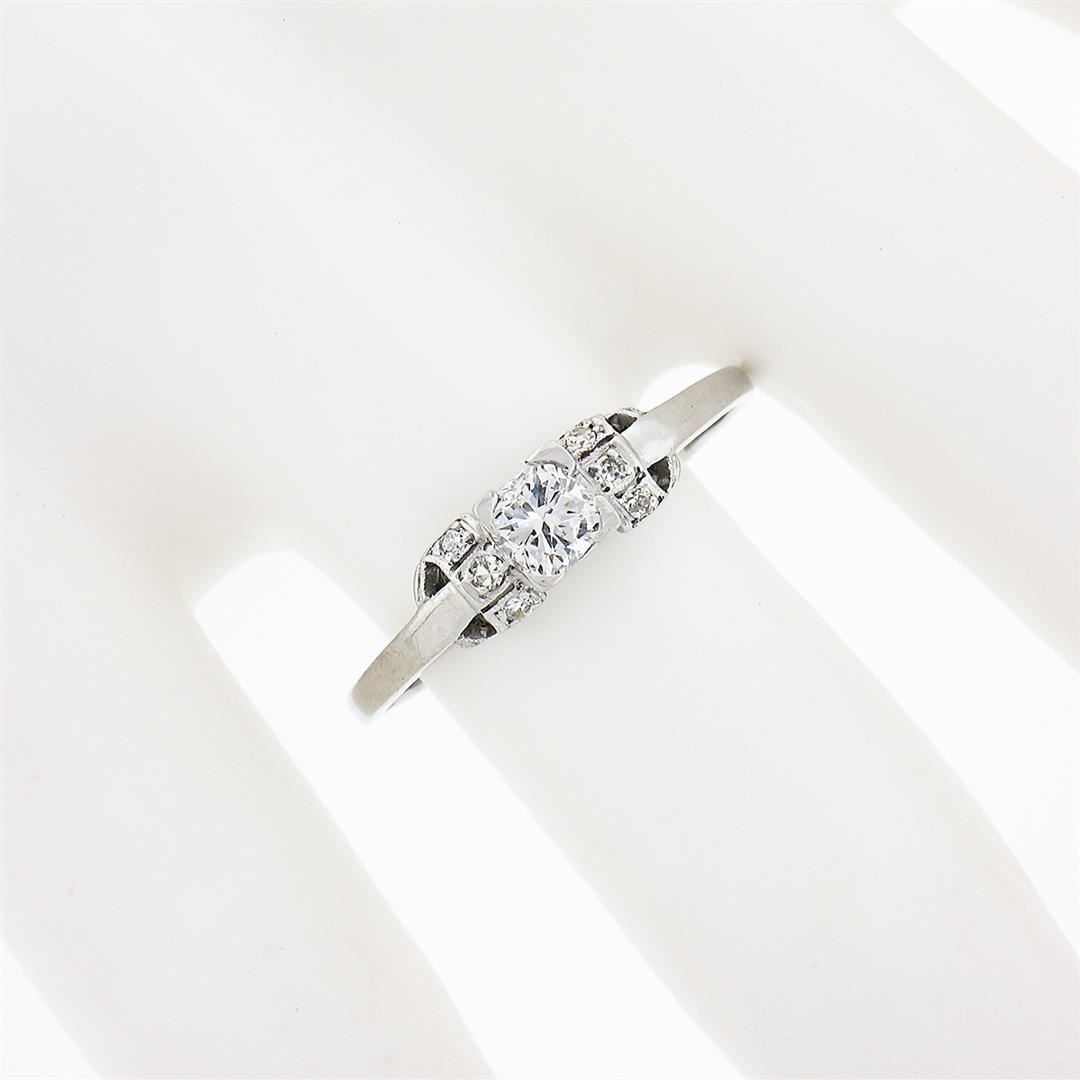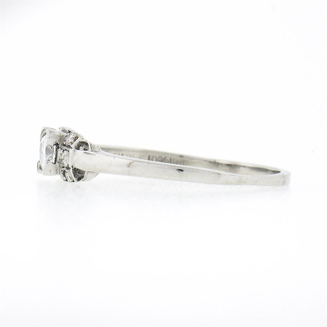An antique solid platinum ring, with 1 old cushion cut natural diamond (G - VVS1 ; 0.26ct), and 6 old single cut natural diamonds (F/G - VS1/VS2 ; 0.06ctw). The ring is size 9.0, weighs a total of 2.40 grams, and measures 4.60mm wide.