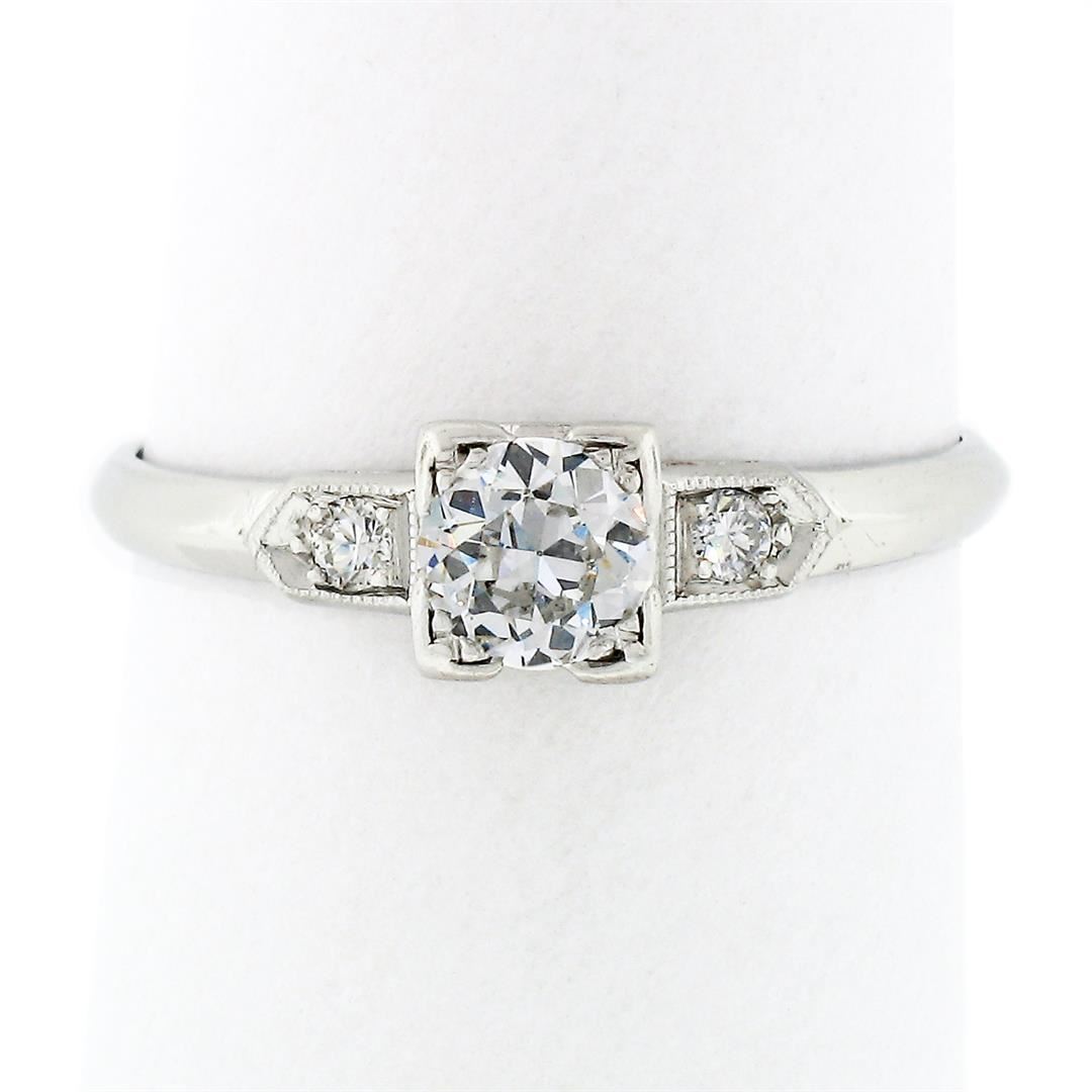 An art deco period solid platinum engagement ring, with 1 old European cut natural diamond (G - VS1; 0.40ct), and 2 old transitional cut natural diamonds (G/H - VS1/VS2; 0.06ctw). The ring is size 6.5, weighs a total of 2.66 grams, and measures 5.1mm wide.