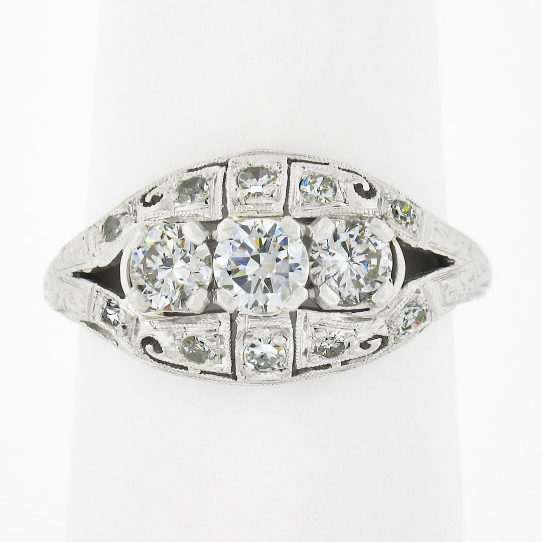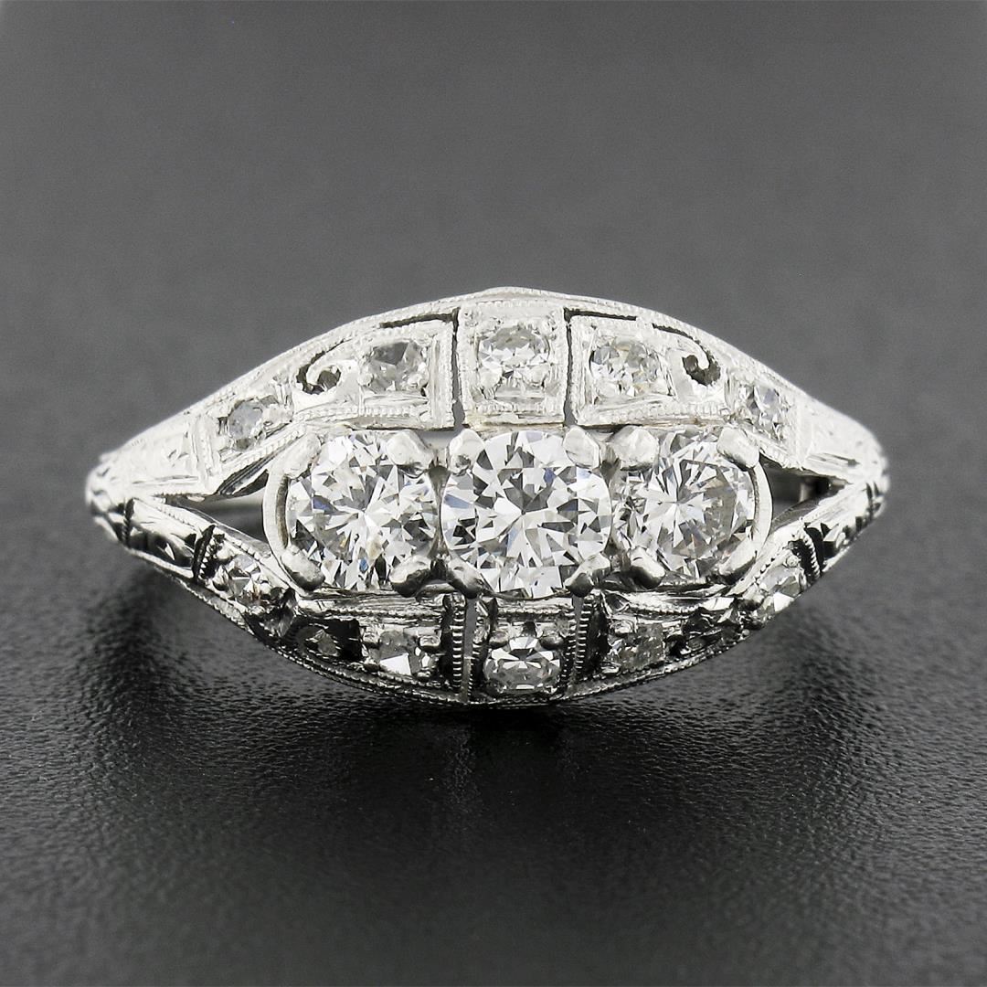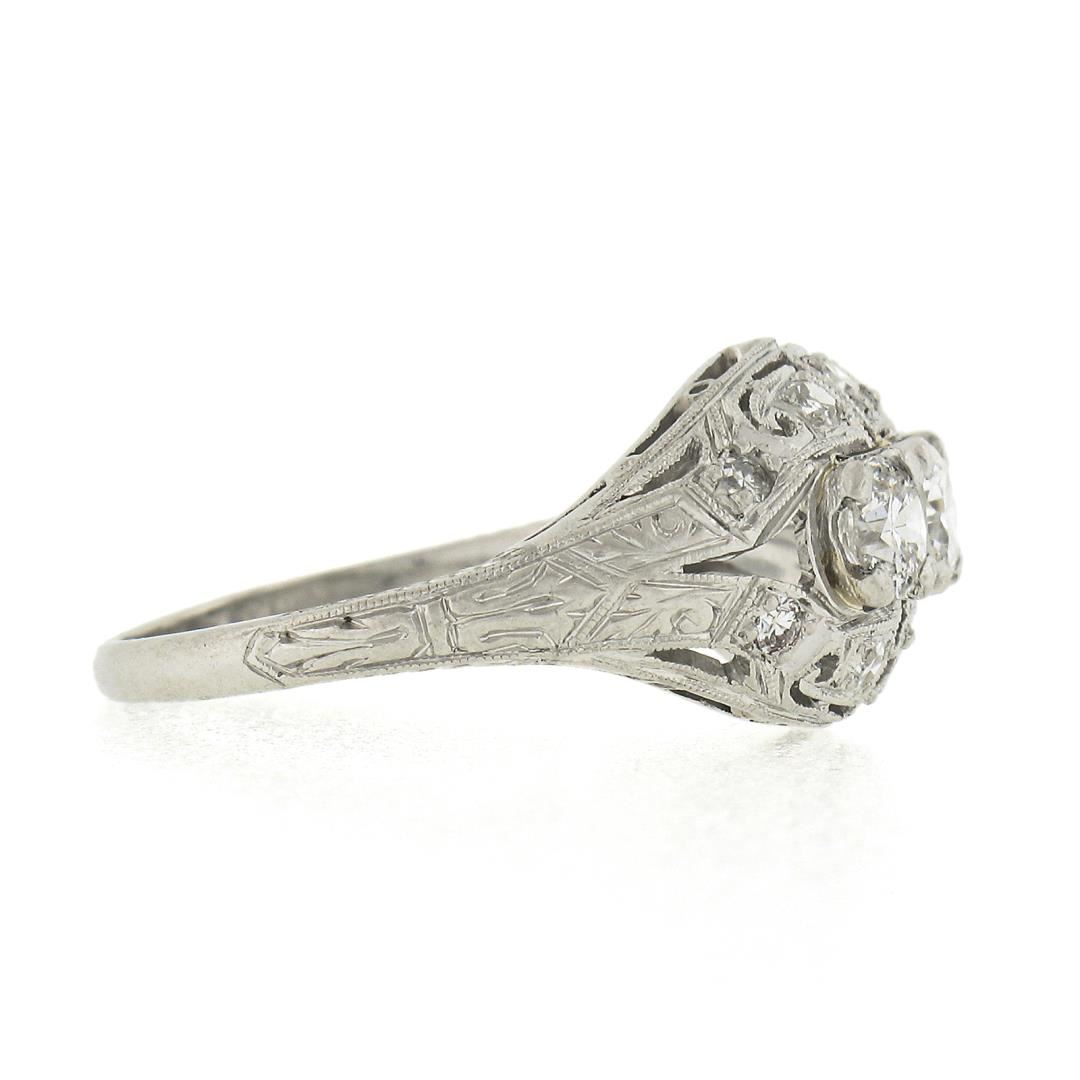 An antique solid platinum ring, with 13 old cut natural diamonds (G-H - VS2-SI2 ; 0.81ctw). The ring is size 6.5, weighs a total of 4.29 grams, and measures 10.5mm wide.
