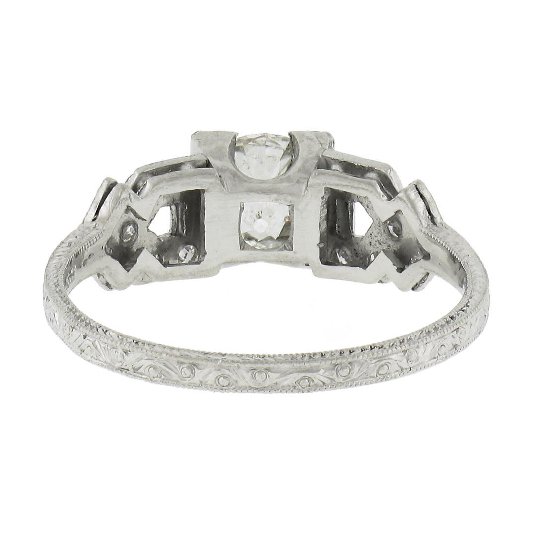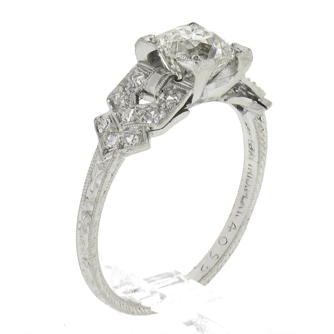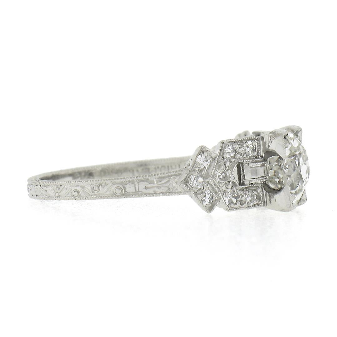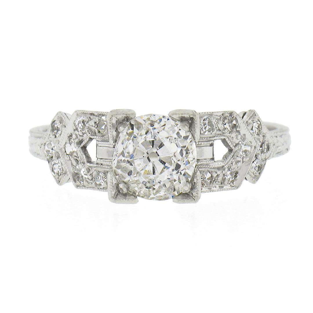 An antique solid platinum engagement ring, with 1 GIA graded old mine cut natural diamond (I - SI2 ; 1.09ct), and 16 old single cut natural diamonds (H/I - VS2/SI1 ; 0.20ctw). The ring is size 7.0, weighs a total of 3.43 grams, and measures 6.8mm wide. Comes with all original relevant certifications.
