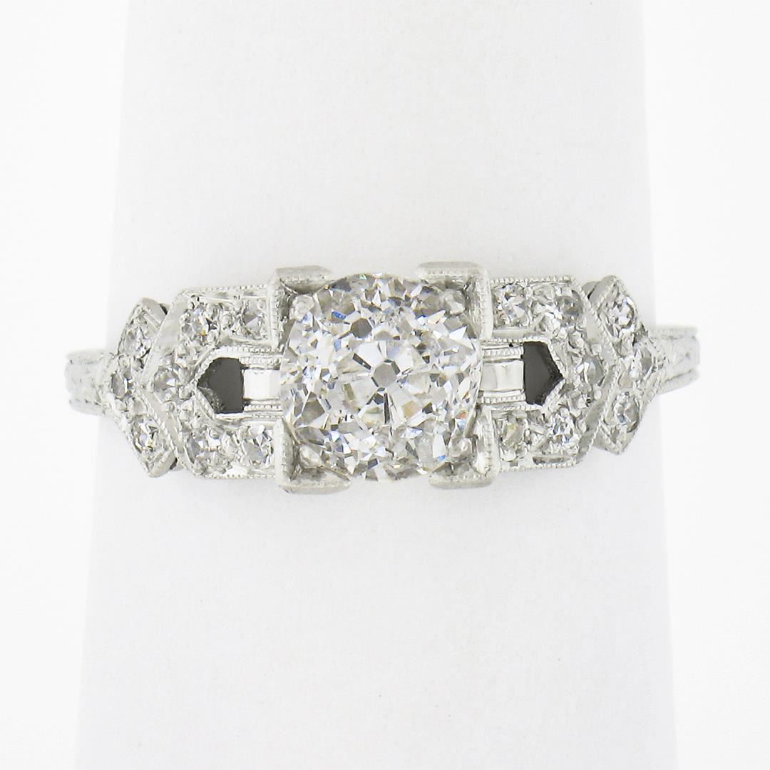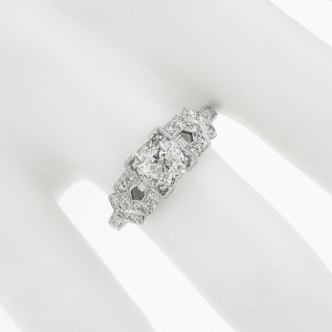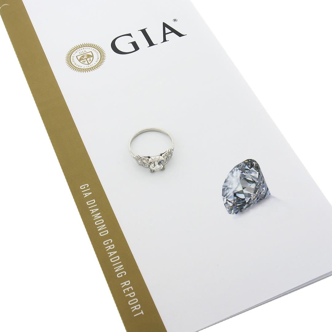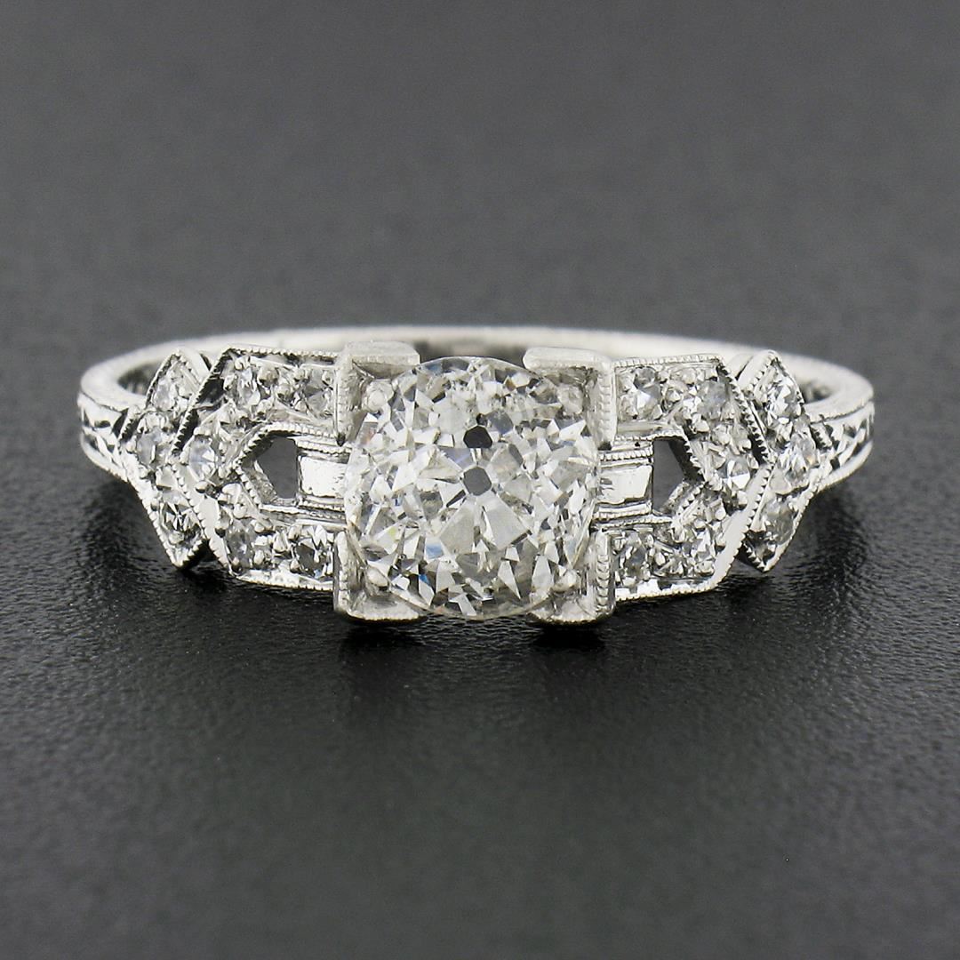 An antique solid platinum engagement ring, with 1 GIA graded old mine cut natural diamond (I - SI2 ; 1.09ct), and 16 old single cut natural diamonds (H/I - VS2/SI1 ; 0.20ctw). The ring is size 7.0, weighs a total of 3.43 grams, and measures 6.8mm wide. Comes with all original relevant certifications.