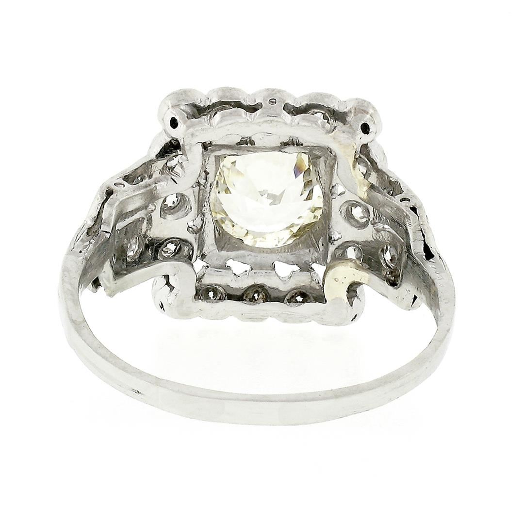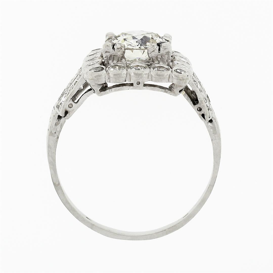 An antique art deco solid platinum engagement ring, featuring 1 old european cut natural diamond (O/P - VS2 ; 6.75mm - 1.20ct), surrounded with 24 round single cut natural diamonds (G/H - VS1 to SI1 ; 0.54ctw). The ring is size 6.0, weighs a total of 4.24 grams, and measures 12.29mm wide.