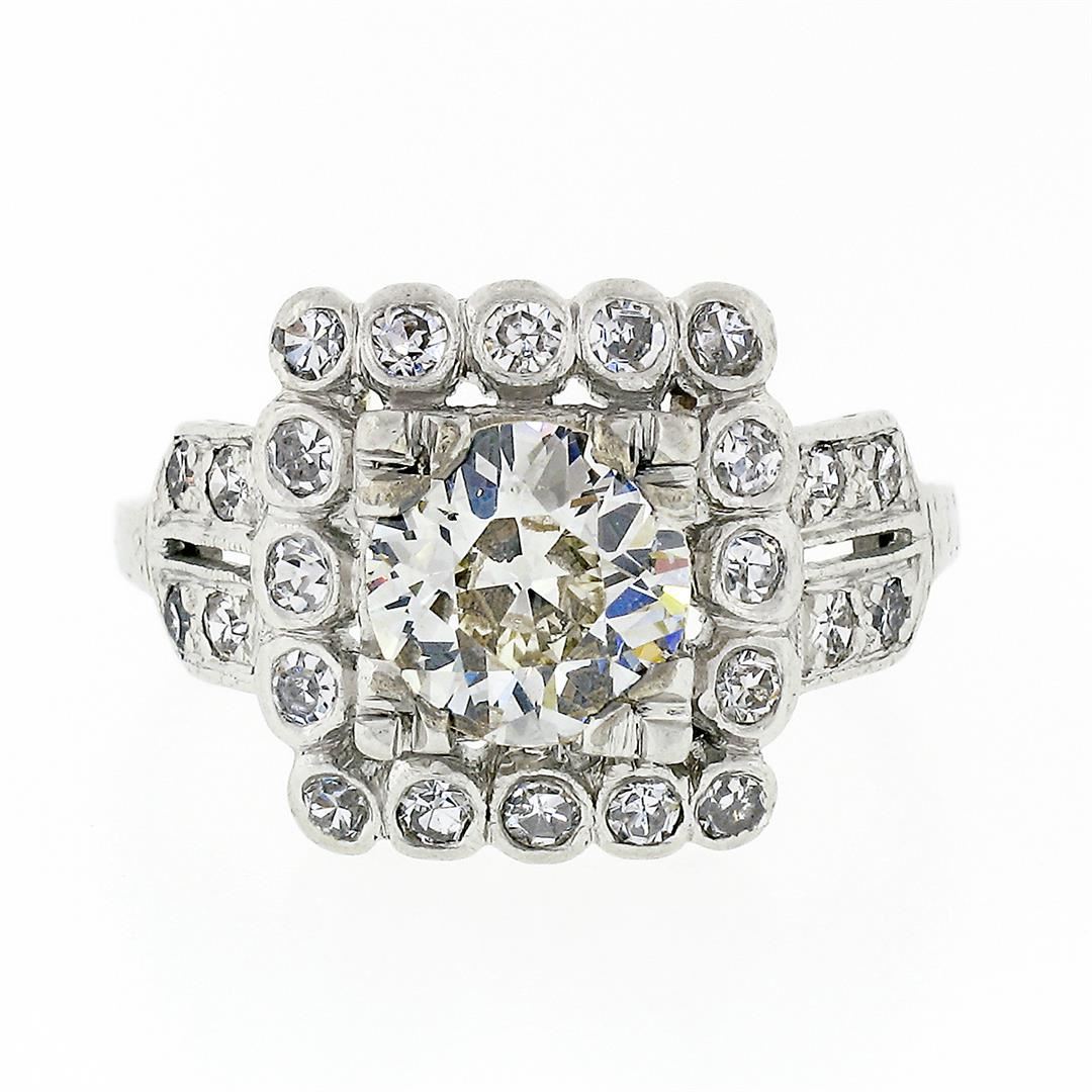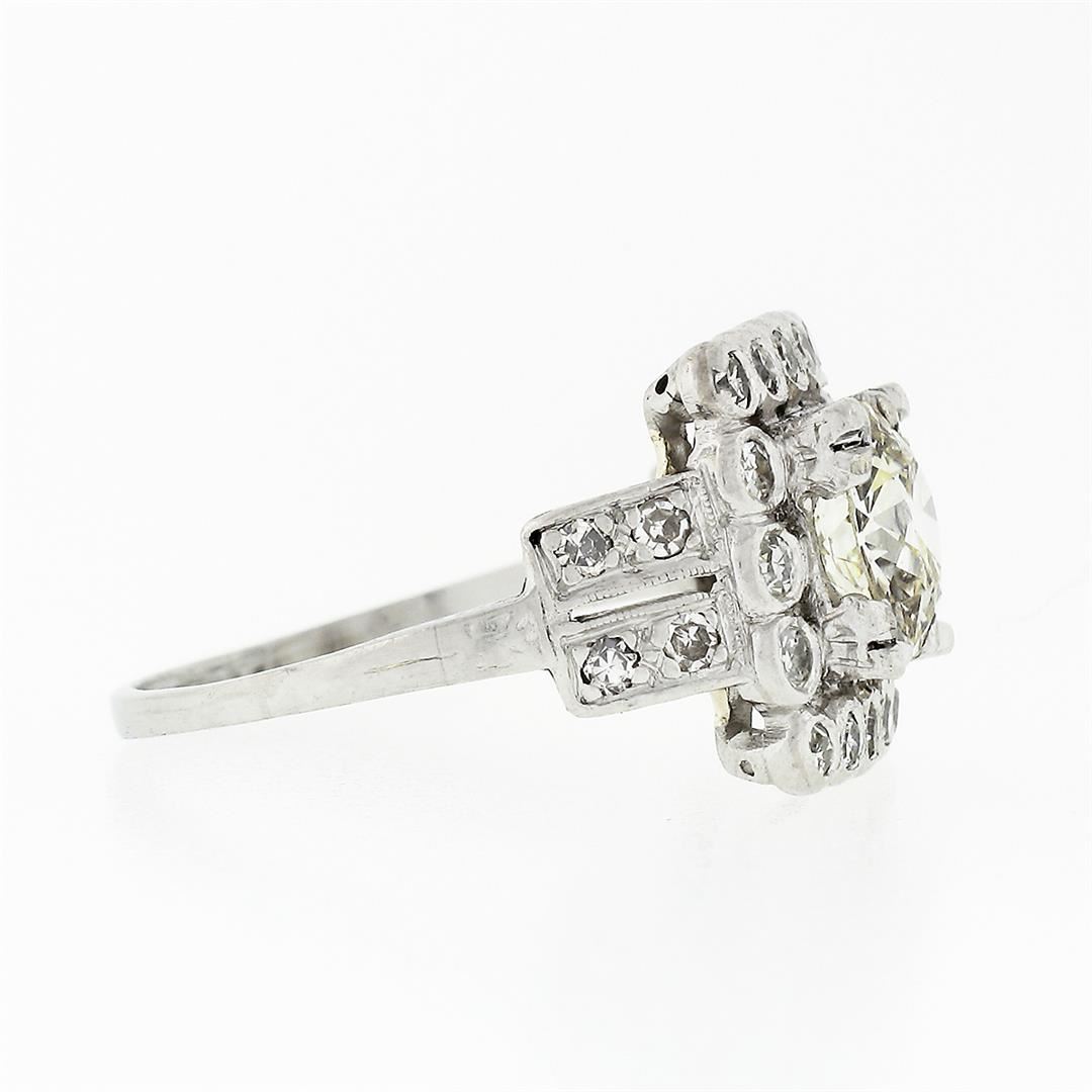 An antique art deco solid platinum engagement ring, featuring 1 old european cut natural diamond (O/P - VS2 ; 6.75mm - 1.20ct), surrounded with 24 round single cut natural diamonds (G/H - VS1 to SI1 ; 0.54ctw). The ring is size 6.0, weighs a total of 4.24 grams, and measures 12.29mm wide.