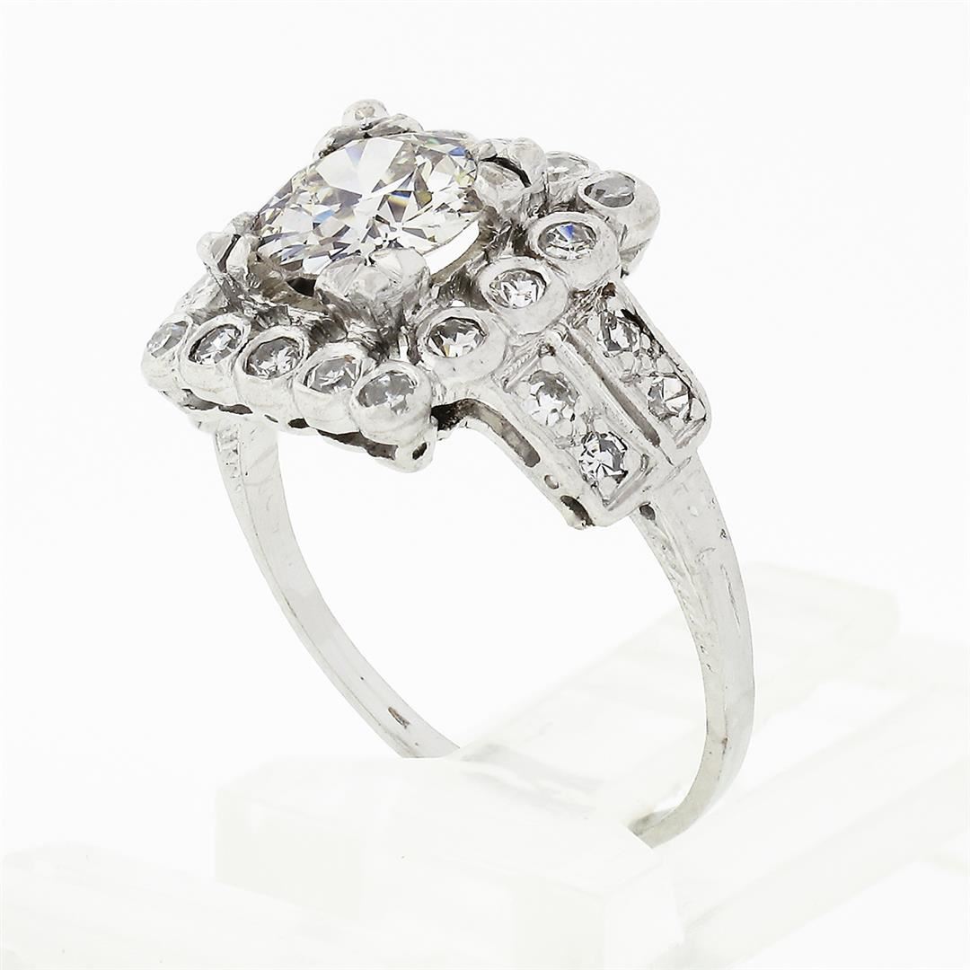 An antique art deco solid platinum engagement ring, featuring 1 old european cut natural diamond (O/P - VS2 ; 6.75mm - 1.20ct), surrounded with 24 round single cut natural diamonds (G/H - VS1 to SI1 ; 0.54ctw). The ring is size 6.0, weighs a total of 4.24 grams, and measures 12.29mm wide.