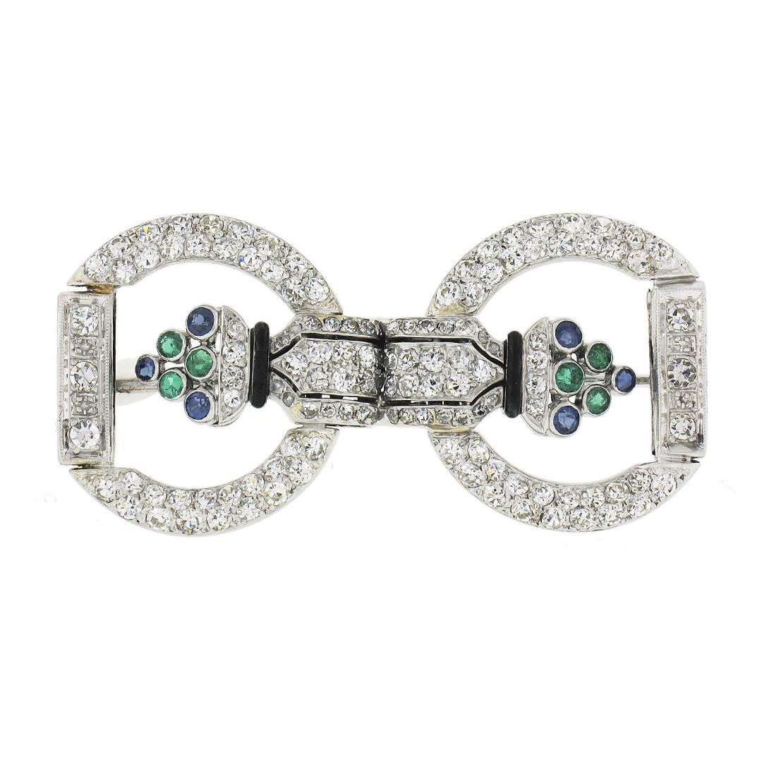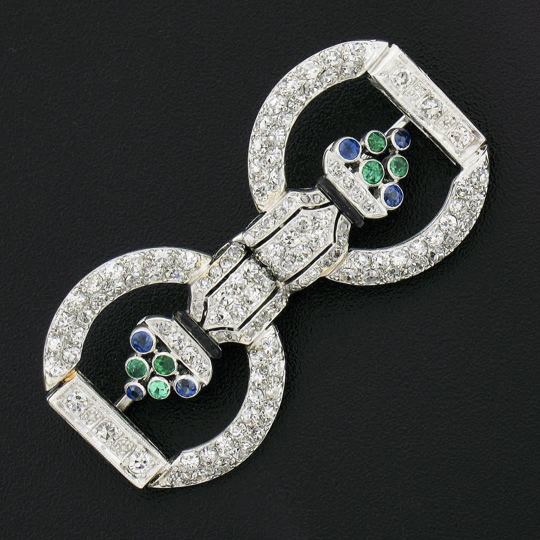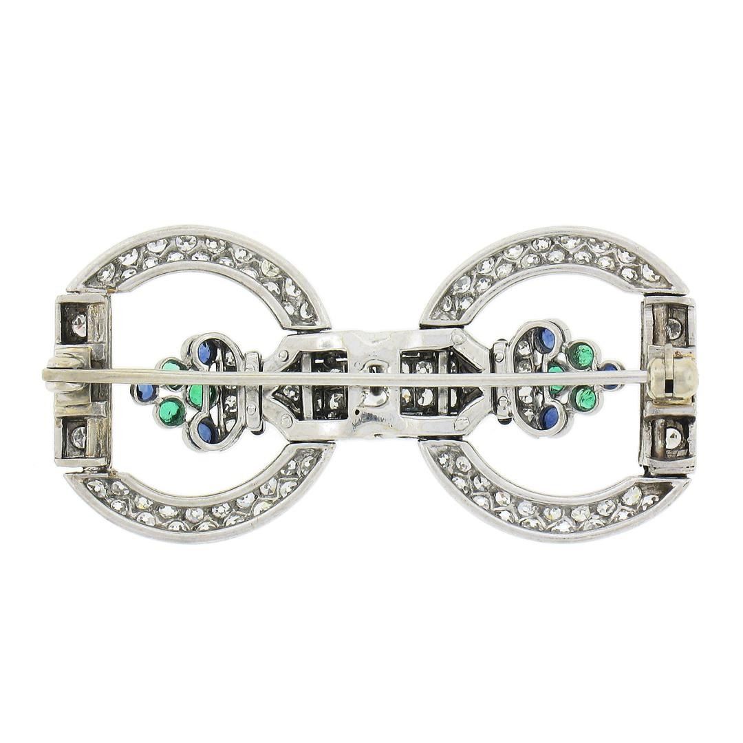 An antique solid platinum brooch, with 124 old european and single cut natural diamonds (G/H Color - VS2-SI2 Clarity - 1.90ctw), 6 old round cut natural emeralds (0.15ctw), and 6 old round cut natural sapphires (0.20ctw). Measures 20.5x41.3mm and weighs a total of 9.18 grams.