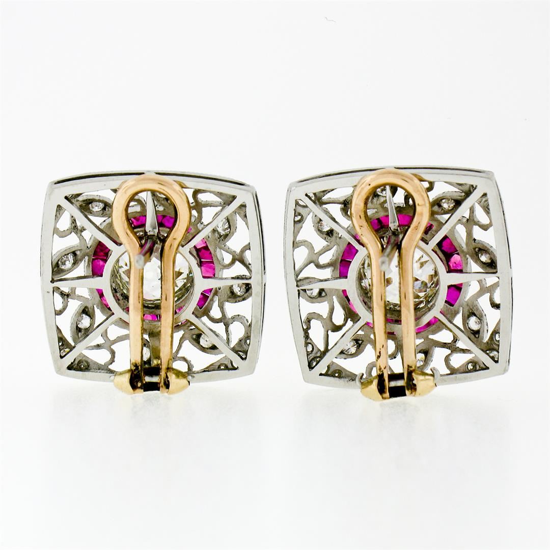 A pair of art deco solid platinum and 18k rose gold earrings, with 2 GIA certified old European brilliant cut natural diamonds (J - SI1/SI2 ; 2.37ctw), surrounded with a halo of 40 custom French cut natural rubies (0.80ctw), and 40 old European with trans