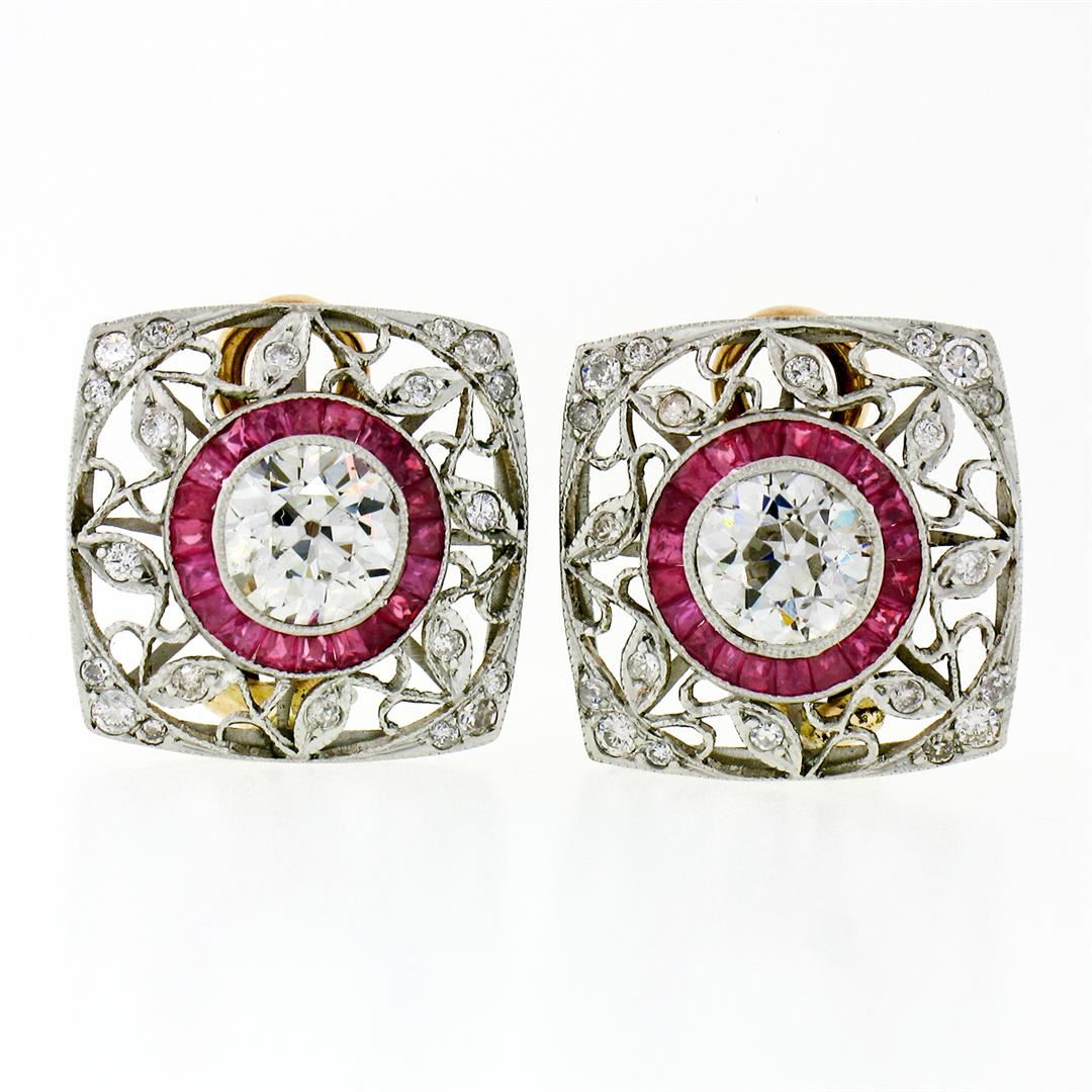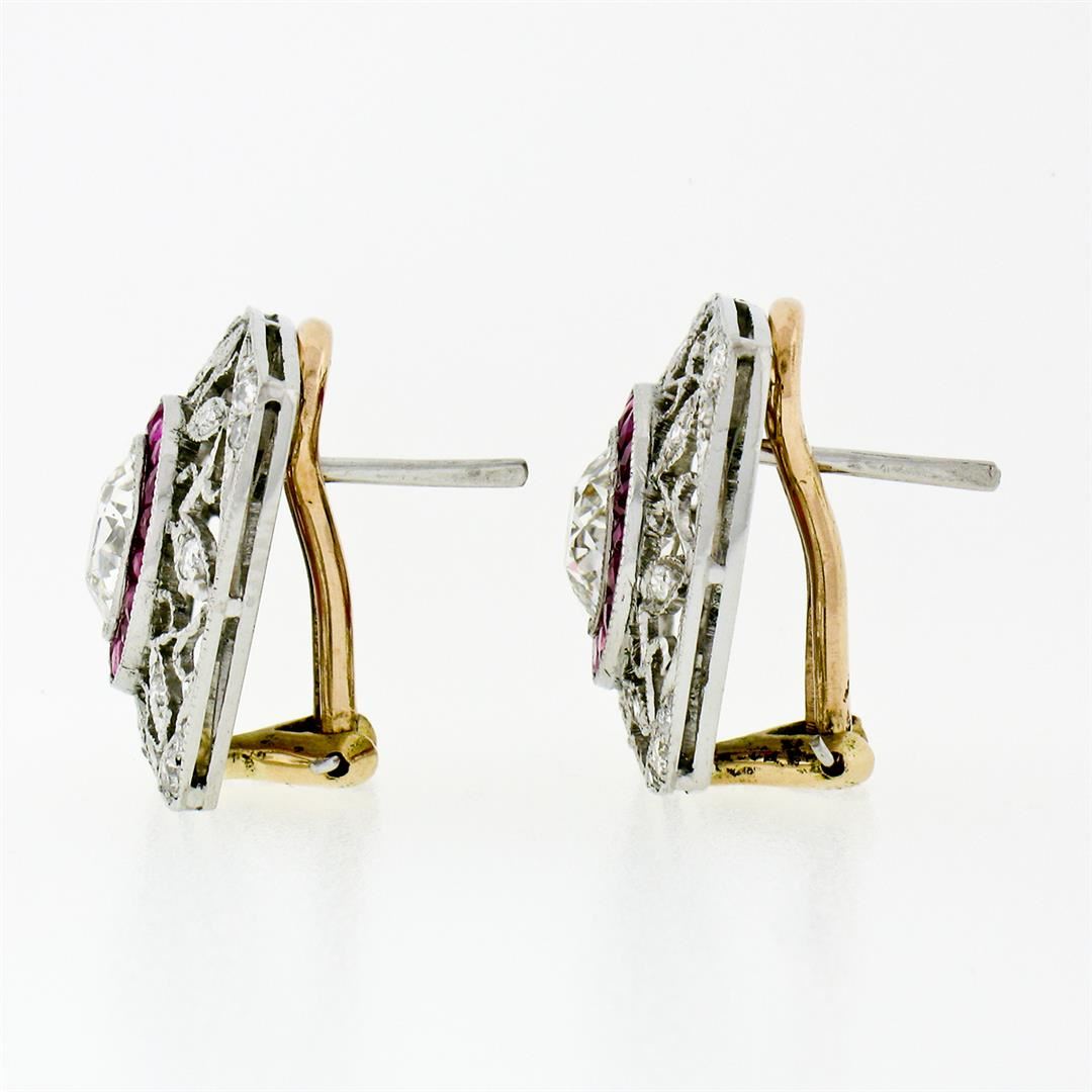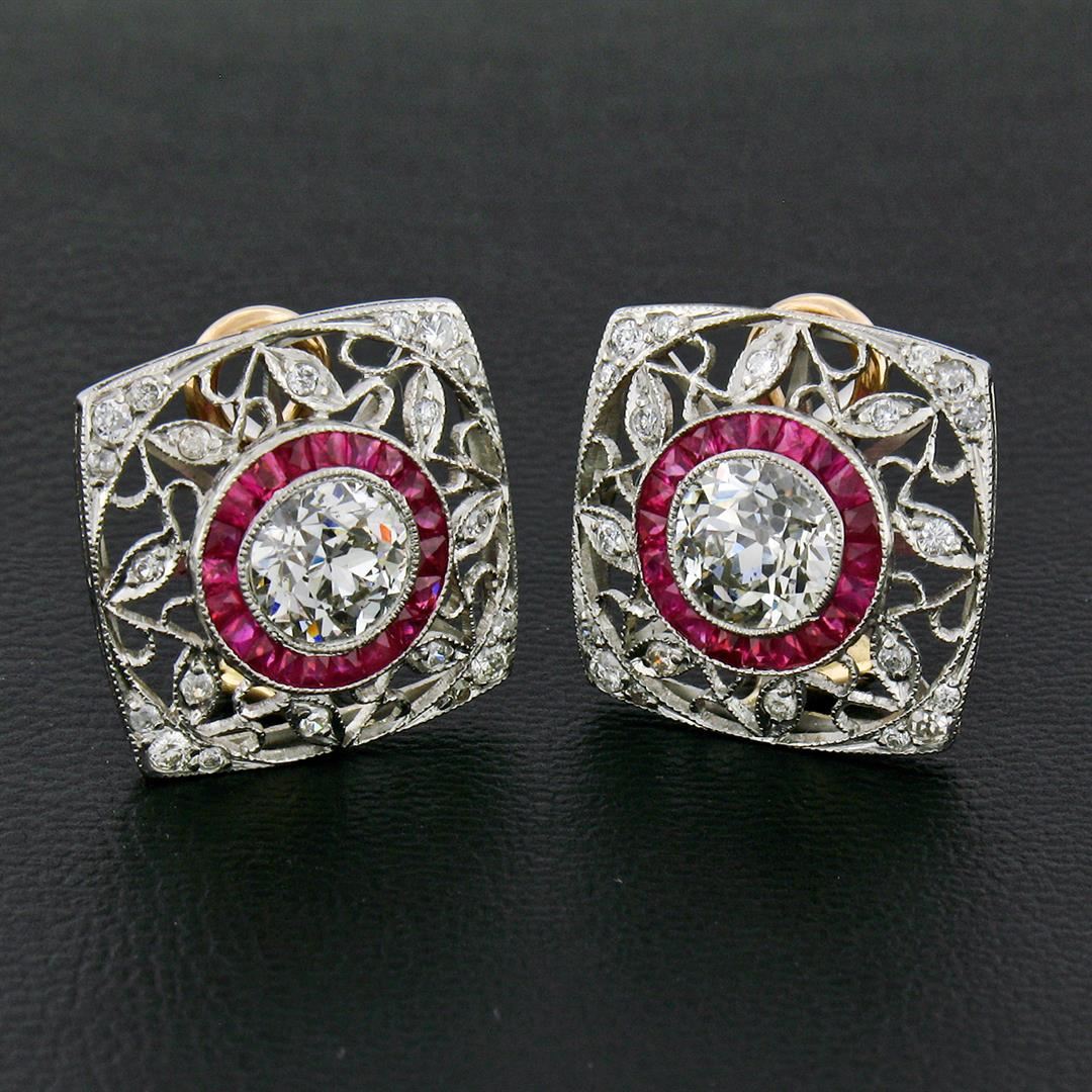 A pair of art deco solid platinum and 18k rose gold earrings, with 2 GIA certified old European brilliant cut natural diamonds (J - SI1/SI2 ; 2.37ctw), surrounded with a halo of 40 custom French cut natural rubies (0.80ctw), and 40 old European with transitional cut natural diamonds (H/I - SI1/SI2 ; 0.40ctw). The earrings measure approximately 21.5x17mm and weigh a total of 8.0 grams. Comes with all original relevant certifications.