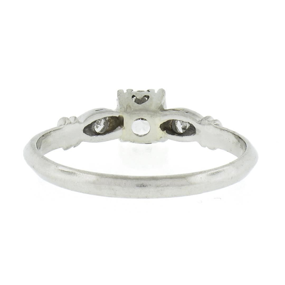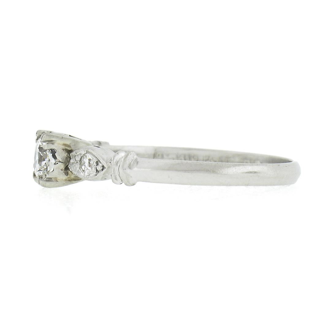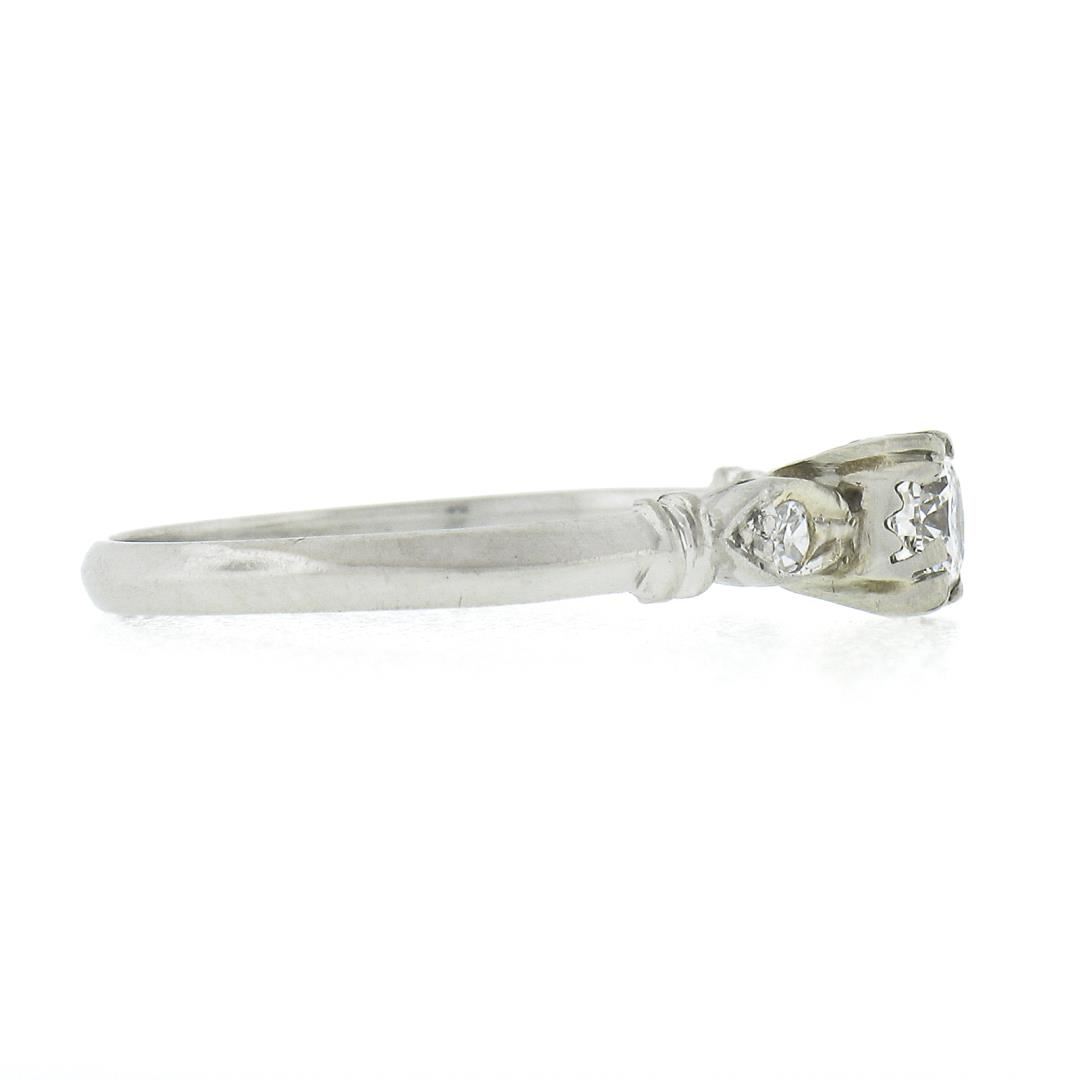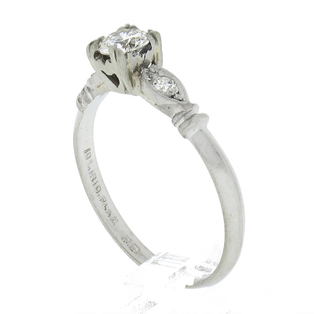 An antique solid platinum engagement ring, with 1 round brilliant cut natural diamond (G-H- VS2 ; 0.30ct), accented with 1 single cut natural diamonds (F-G - SI1-SI2 ; 0.04ctw). The ring is size 6.5, weighs a total of 2.30 grams, and measures 4.65mm wide.