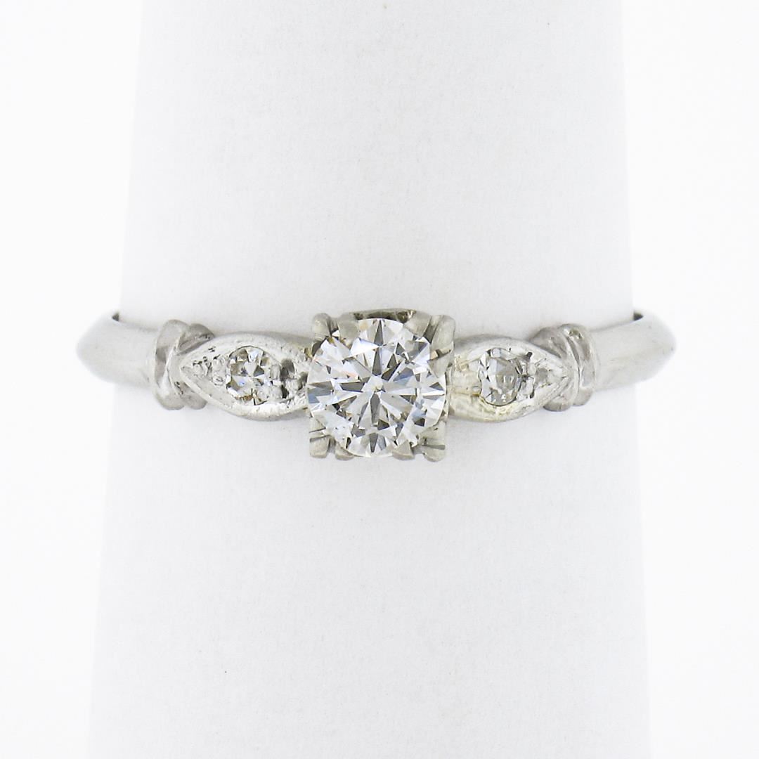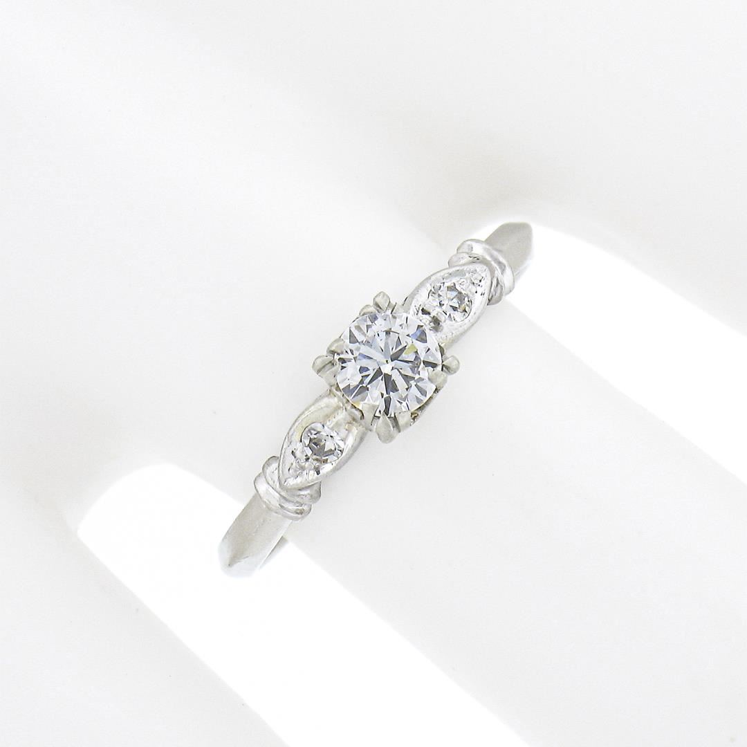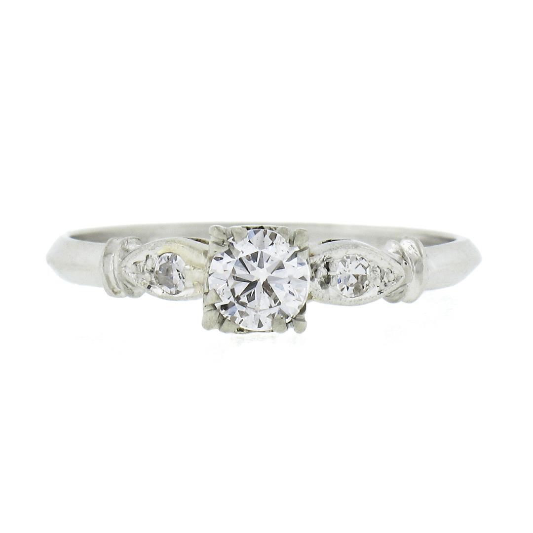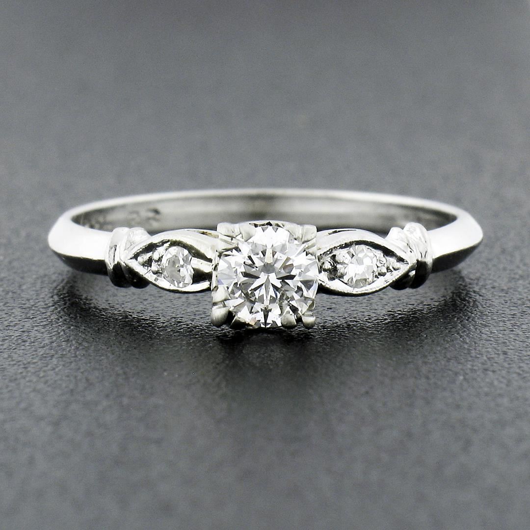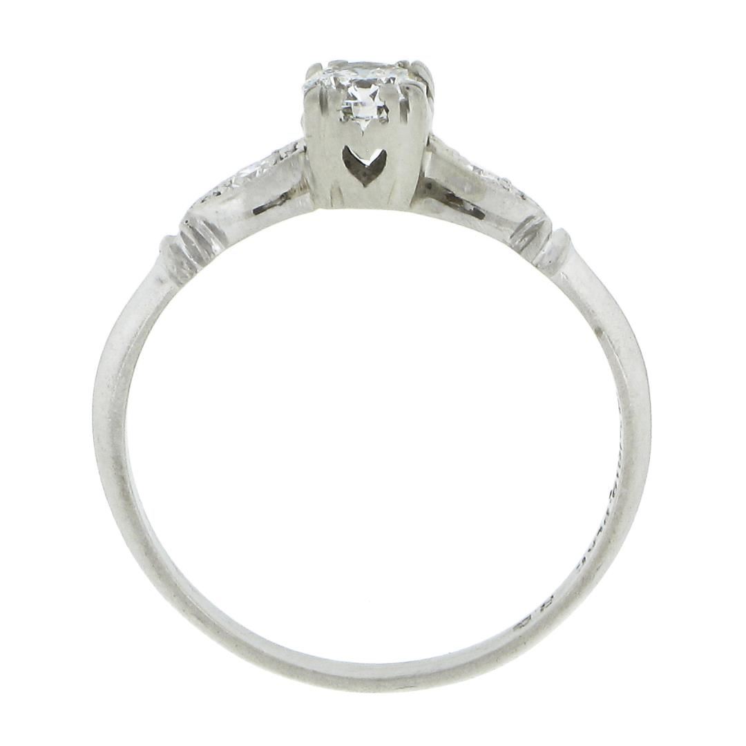 An antique solid platinum engagement ring, with 1 round brilliant cut natural diamond (G-H- VS2 ; 0.30ct), accented with 1 single cut natural diamonds (F-G - SI1-SI2 ; 0.04ctw). The ring is size 6.5, weighs a total of 2.30 grams, and measures 4.65mm wide.