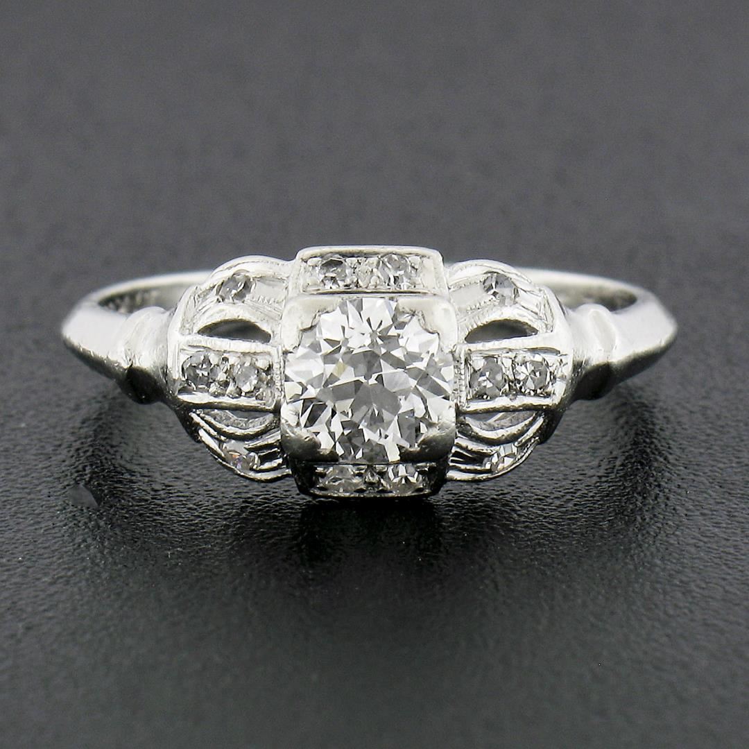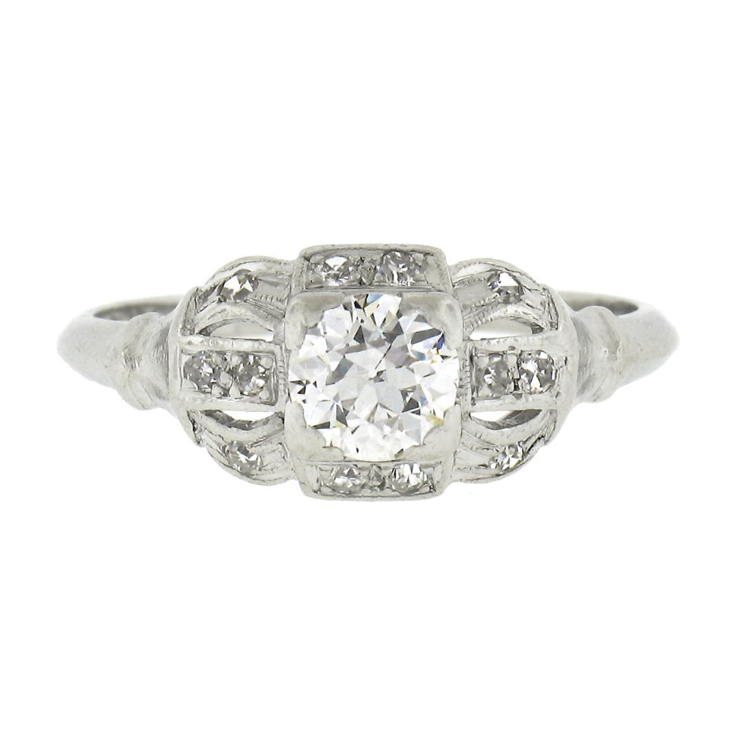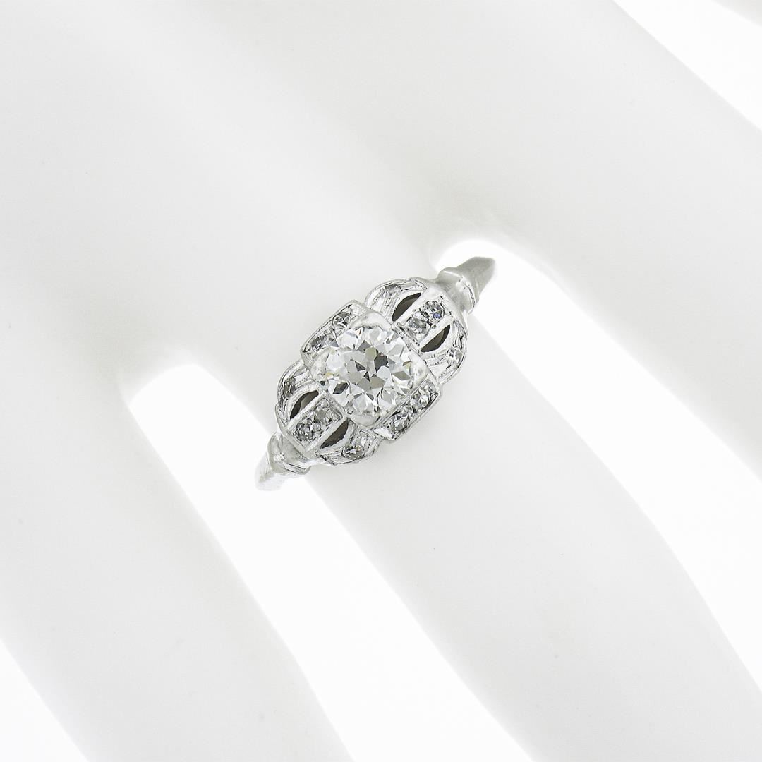 An antique solid platinum engagement ring, with 1 old european cut natural diamond (H - VS2 ; 0.50ct), and 12 old single cut natural diamonds (G/H - VS2-I1 ; 0.12ctw). The ring is size 6.5, weighs a total of 3.02 grams, and measures 7.6mm wide.