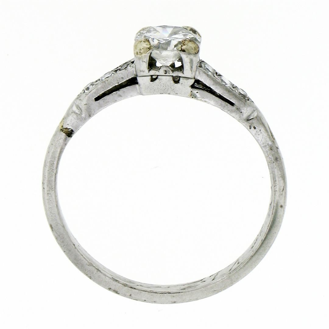 An antique solid platinum solitaire ring, featuring 1 transitional cut natural diamond (E - VS1 ; 0.56ct), and 6 round single cut natural diamonds (F - VS2 ; 0.09ctw ). The ring is size 7.0, weighs a total of 3.22 grams, and measures 5.40mm wide.