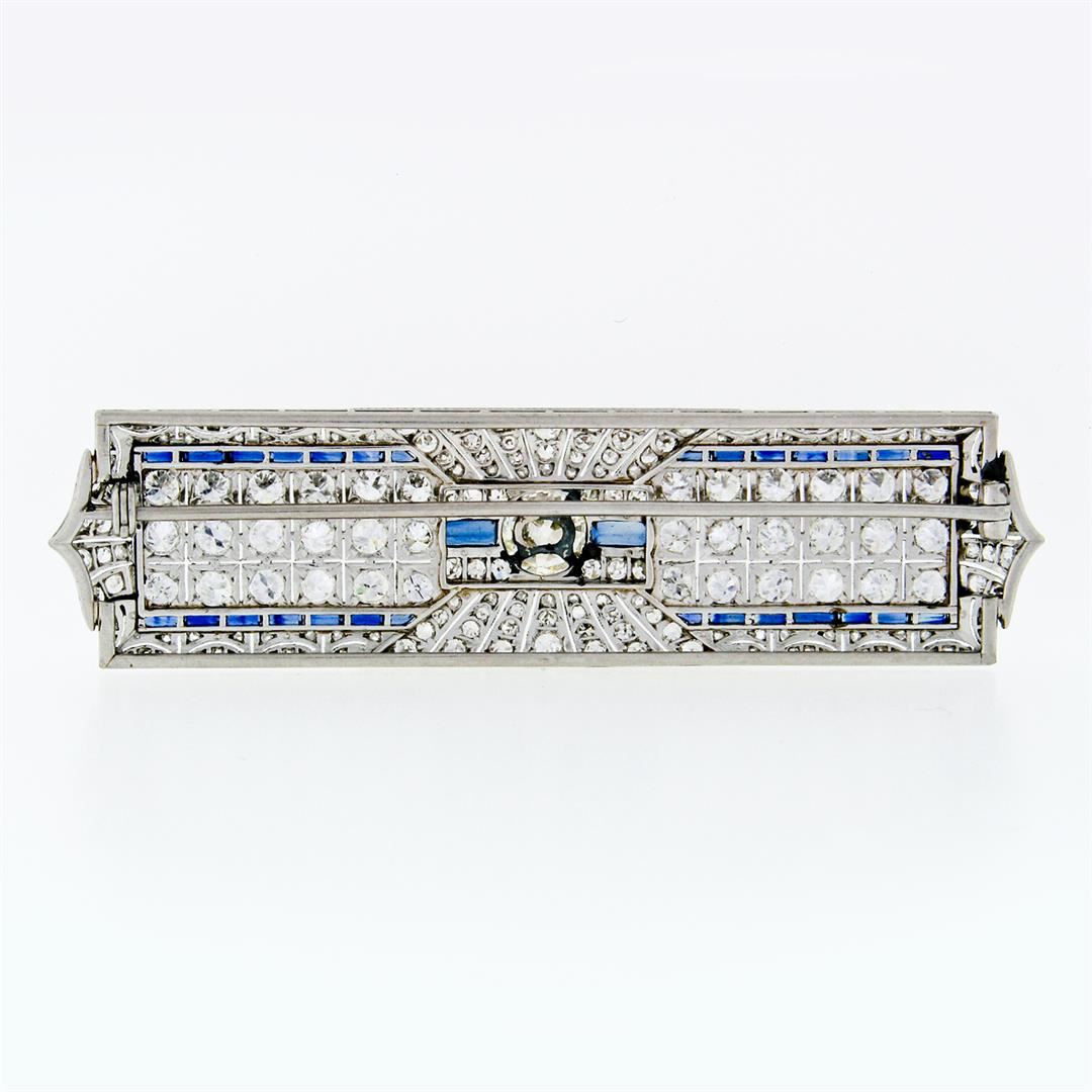 An antique. art deco solid platinum bar pin brooch, with 195 old european/rose/single cut natural diamonds (G-L - VS1-SI1; 7.24ctw), and 2 custom bullet cut synthetic sapphires, with straight baguette cut synthetic sapphires. Measures 19.22x73.48mm and weighs a total of 18.09 grams.